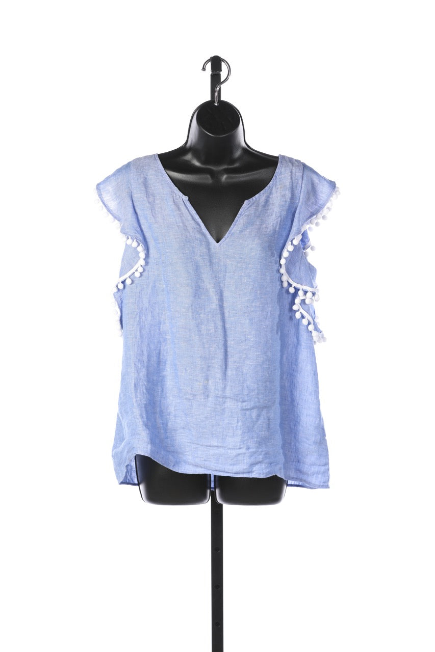 Lilly Pulitzer Linen Purple Cap Ruffle Sleeve Top w White Ball Tassels