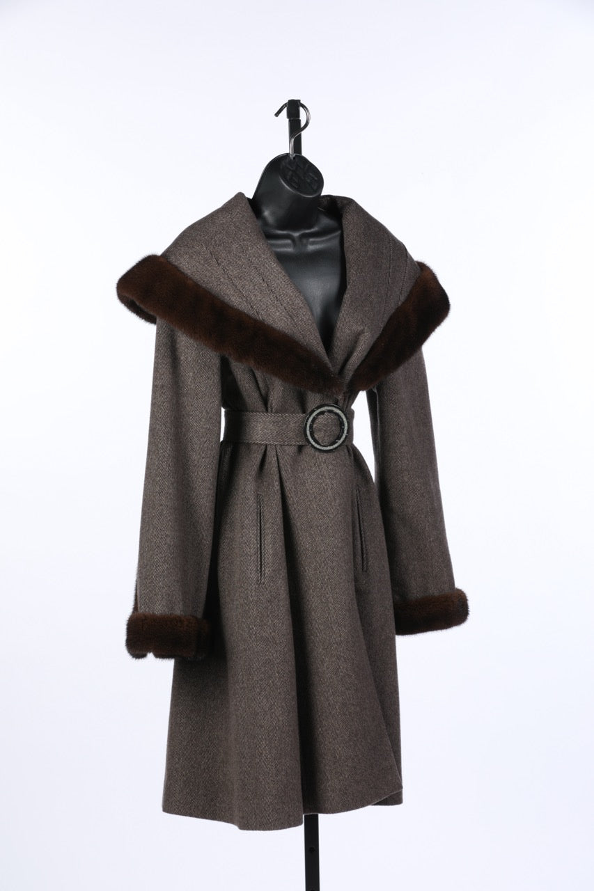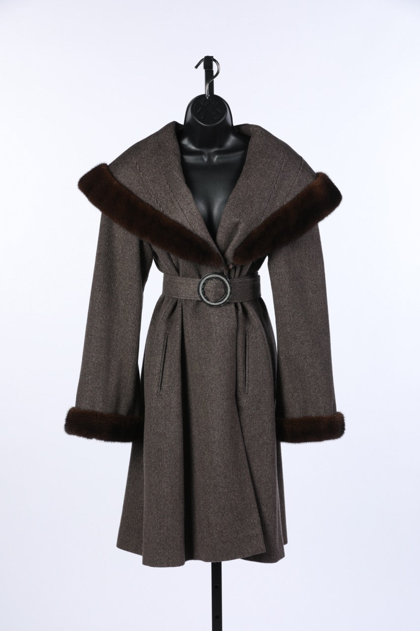 Loro Piana Brown Cashmere/Wool Shawl Collar Full-Length Coat w Fur Trim & Belt