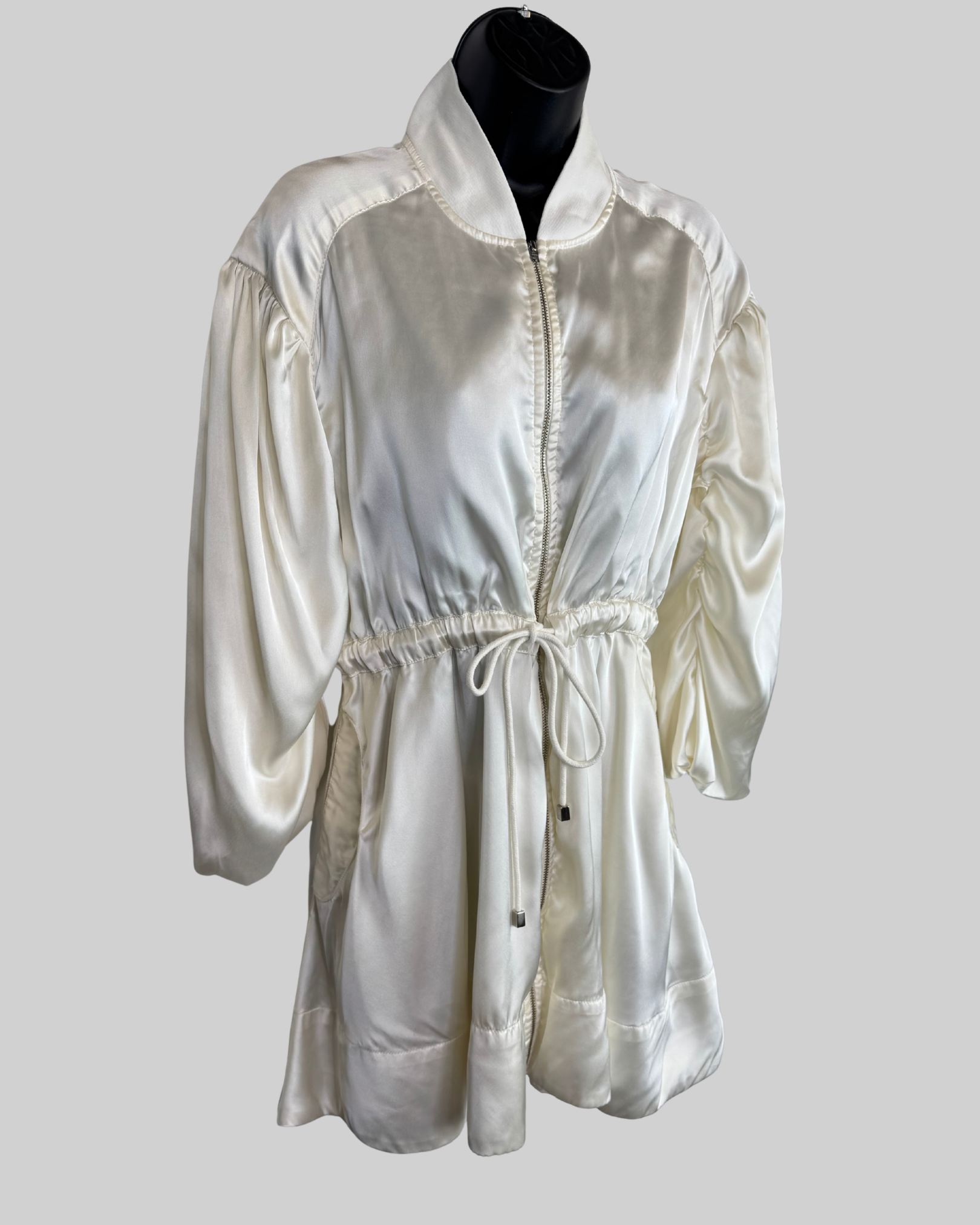 Love the Label Cream Satin Zip Down Long Sleeve Dress w/ Drawstring Waist