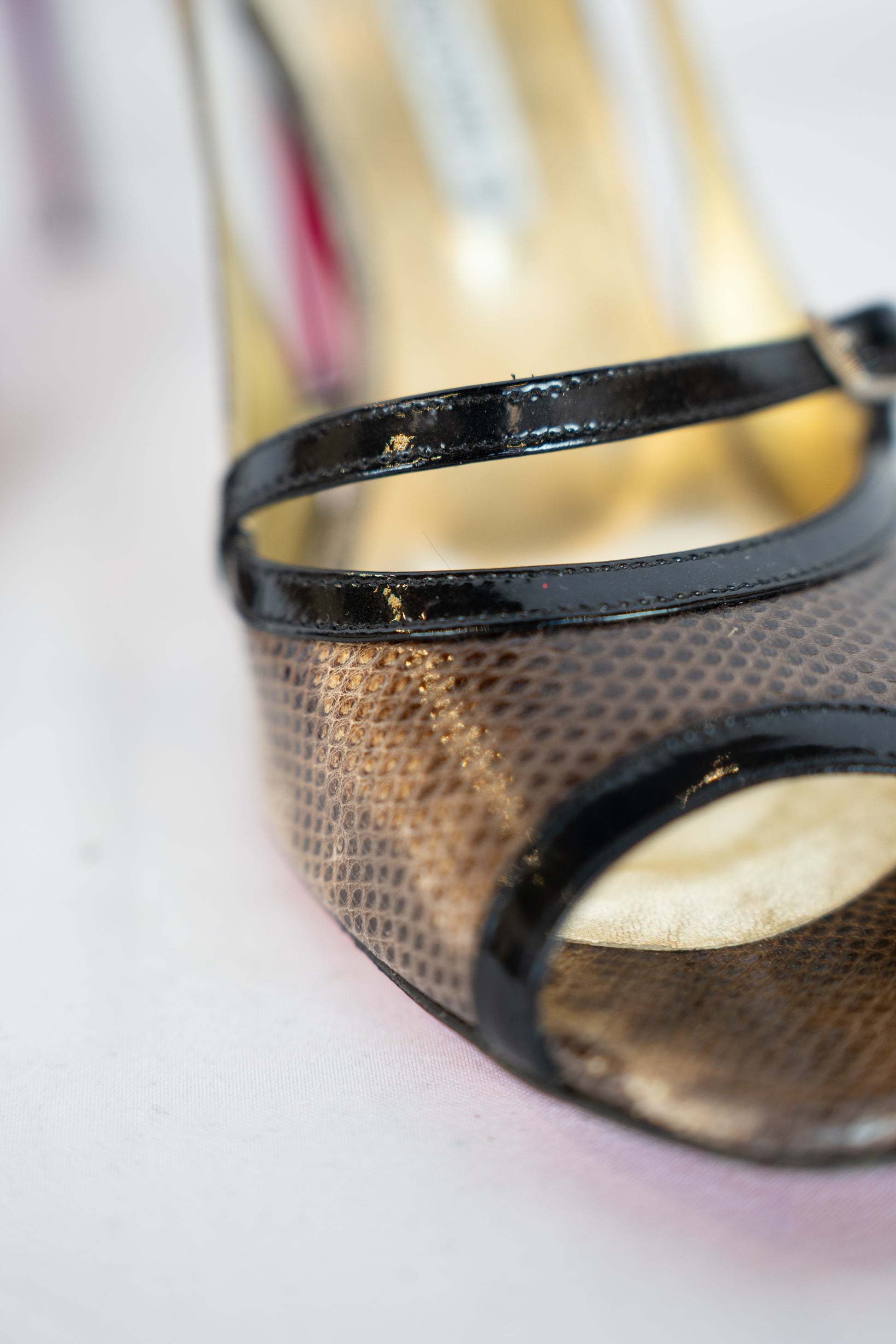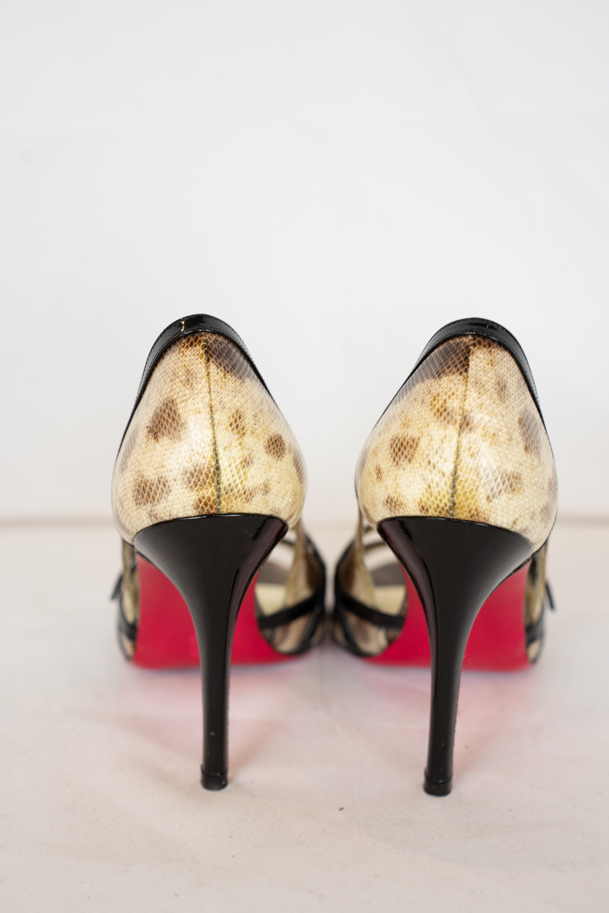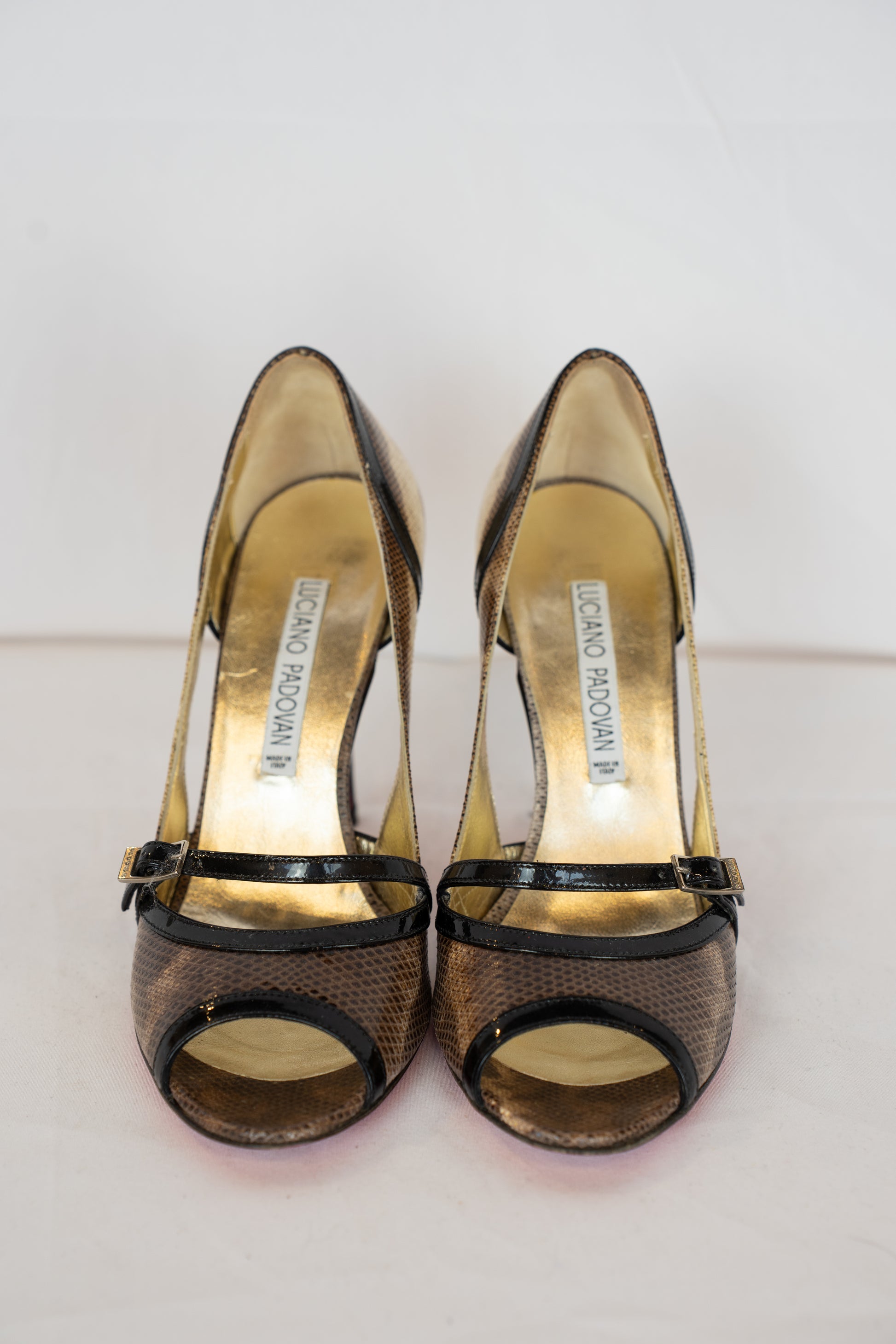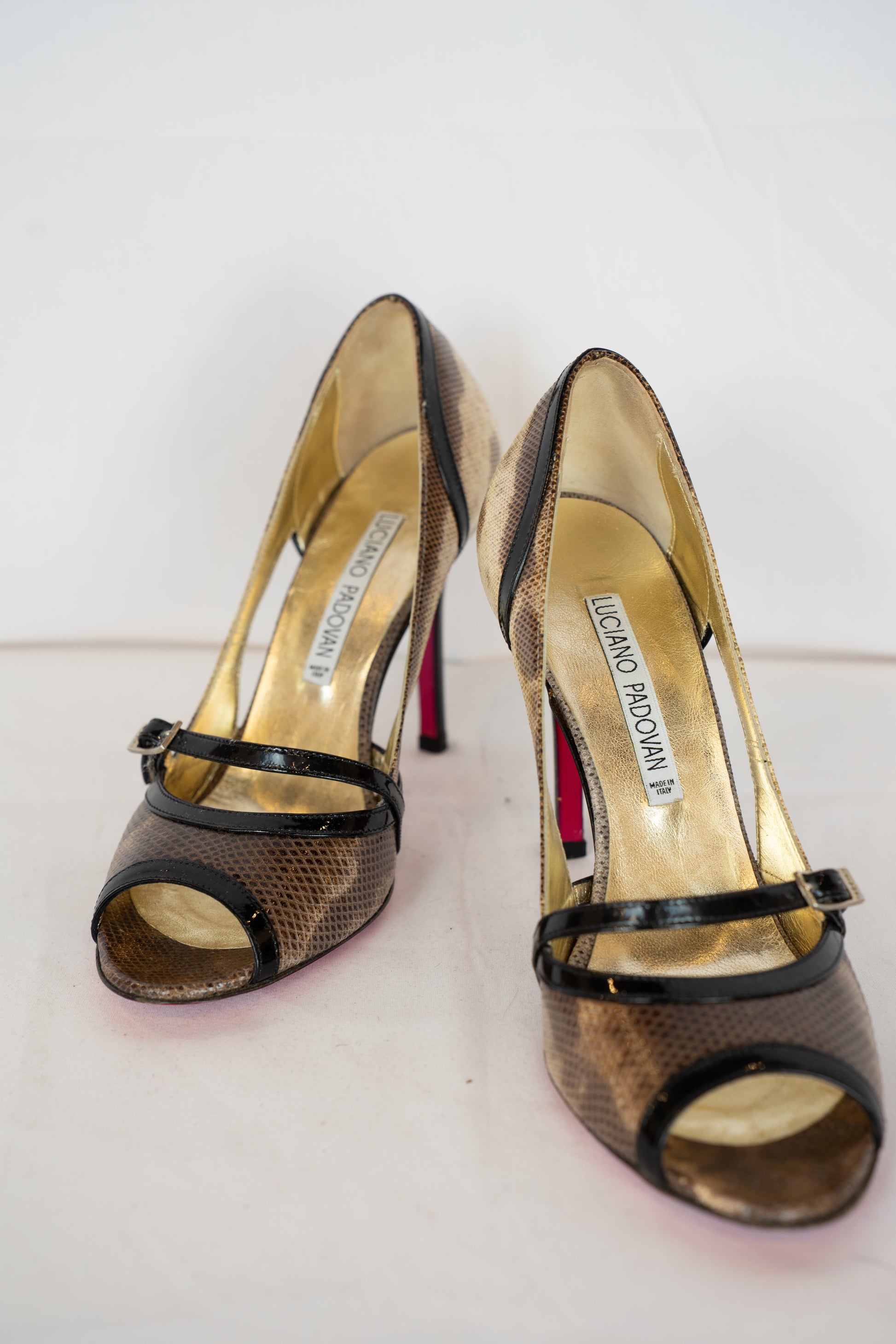 Luciano Padovan Ombre Brown Snakeskin Peep Toe Buckle Strap Pumps w Black Trim