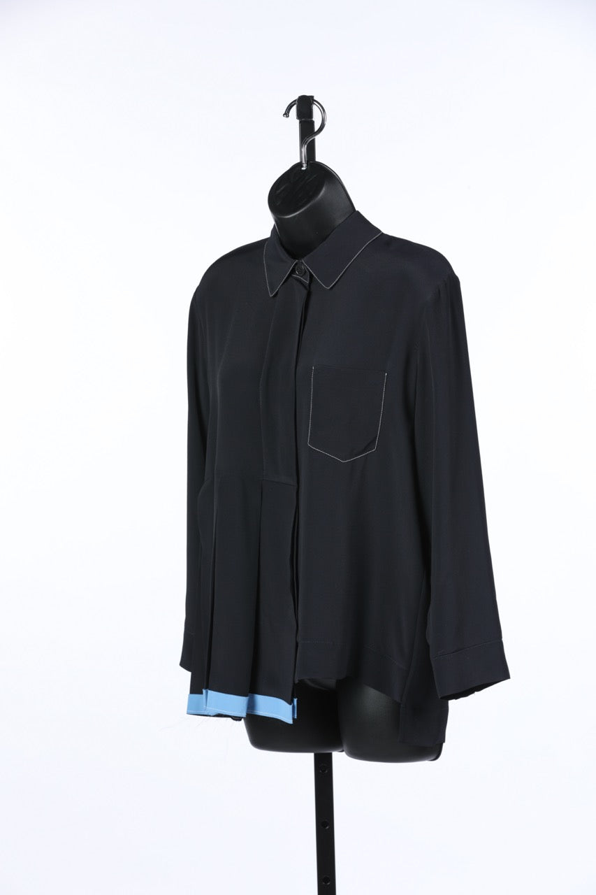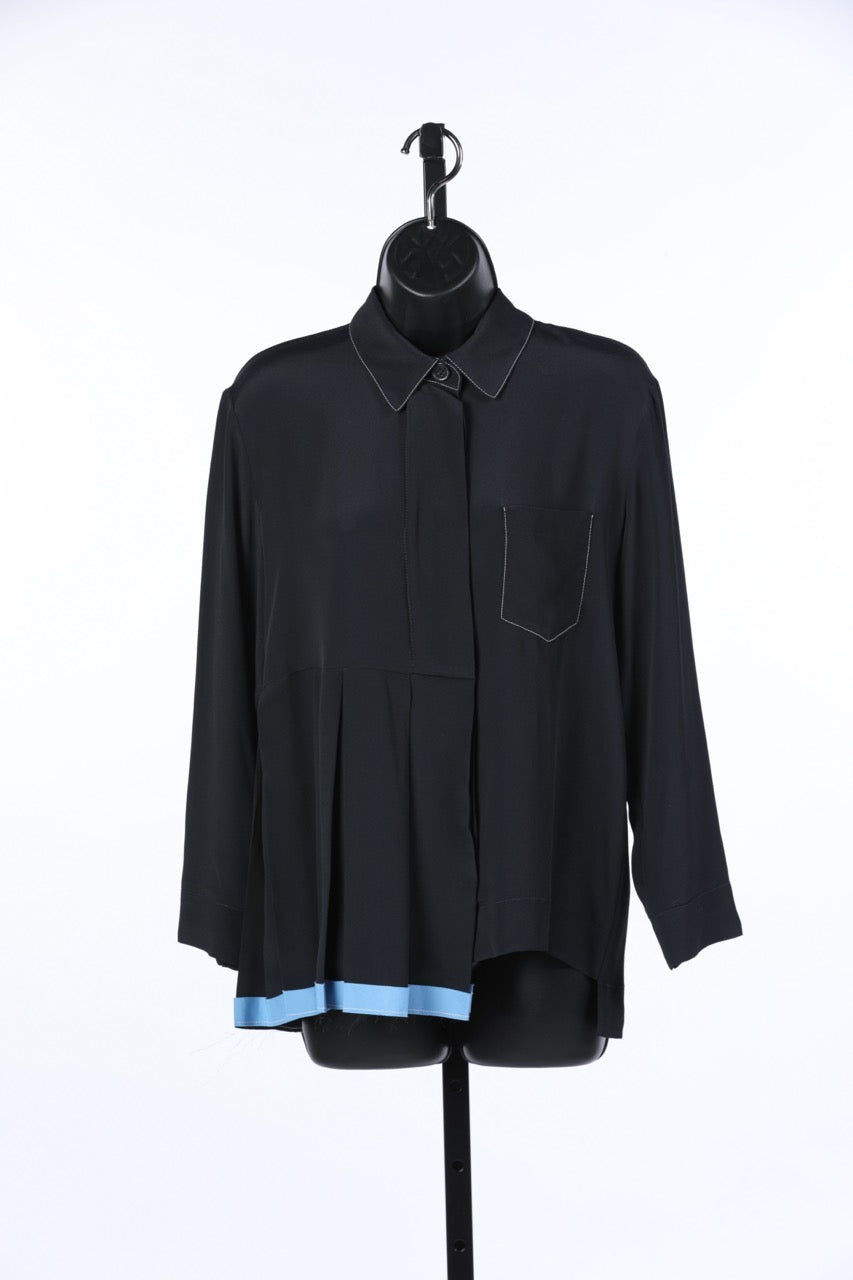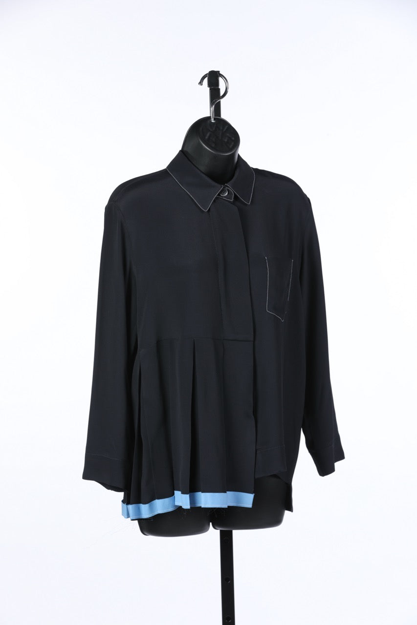 Marni Navy w Baby Blue Asymmetrical Button Up Long Sleeve Blouse w Side Pleating NWT