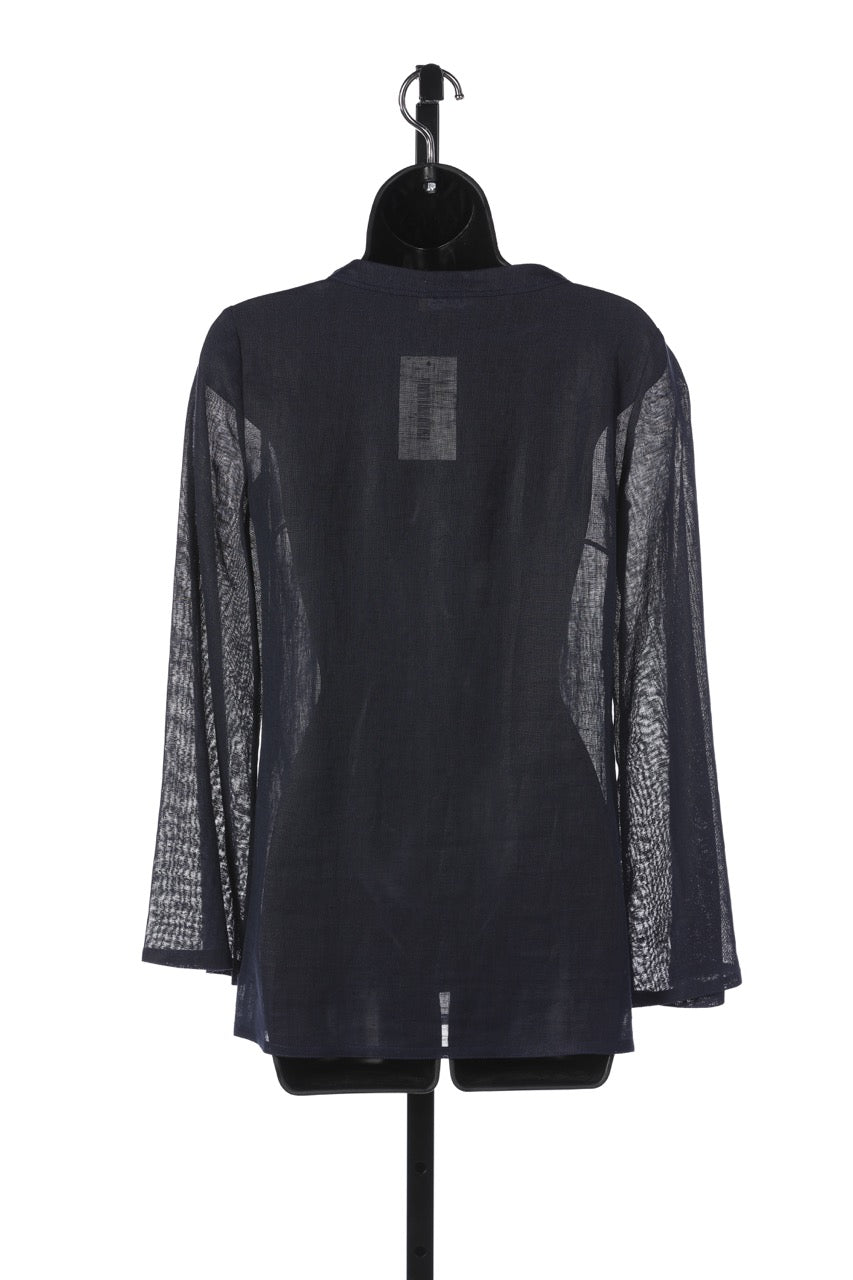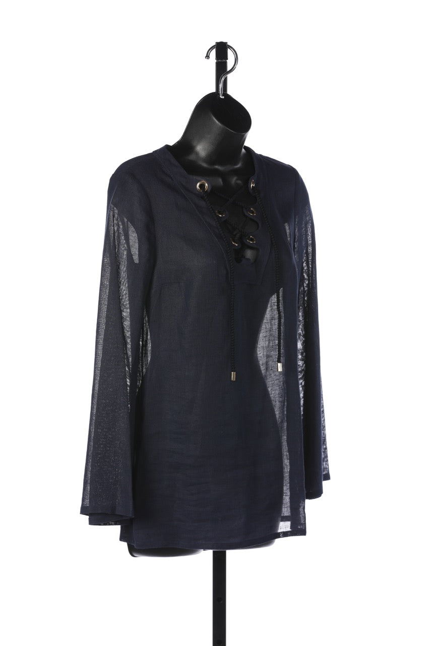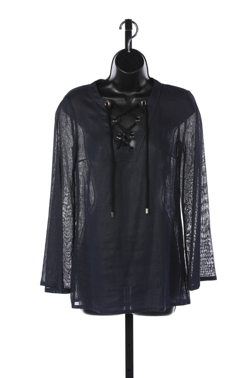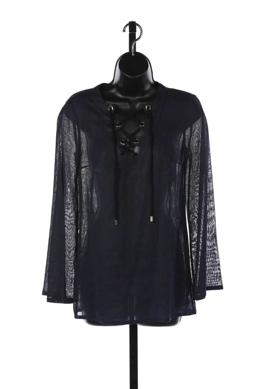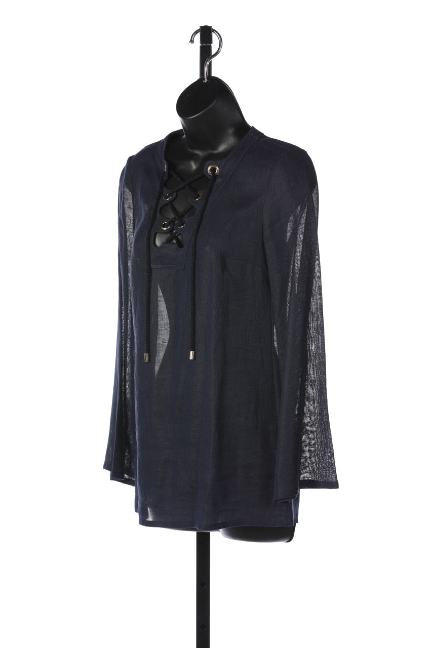 Michael Kors Navy Linen Lace Up Long Sleeve Top