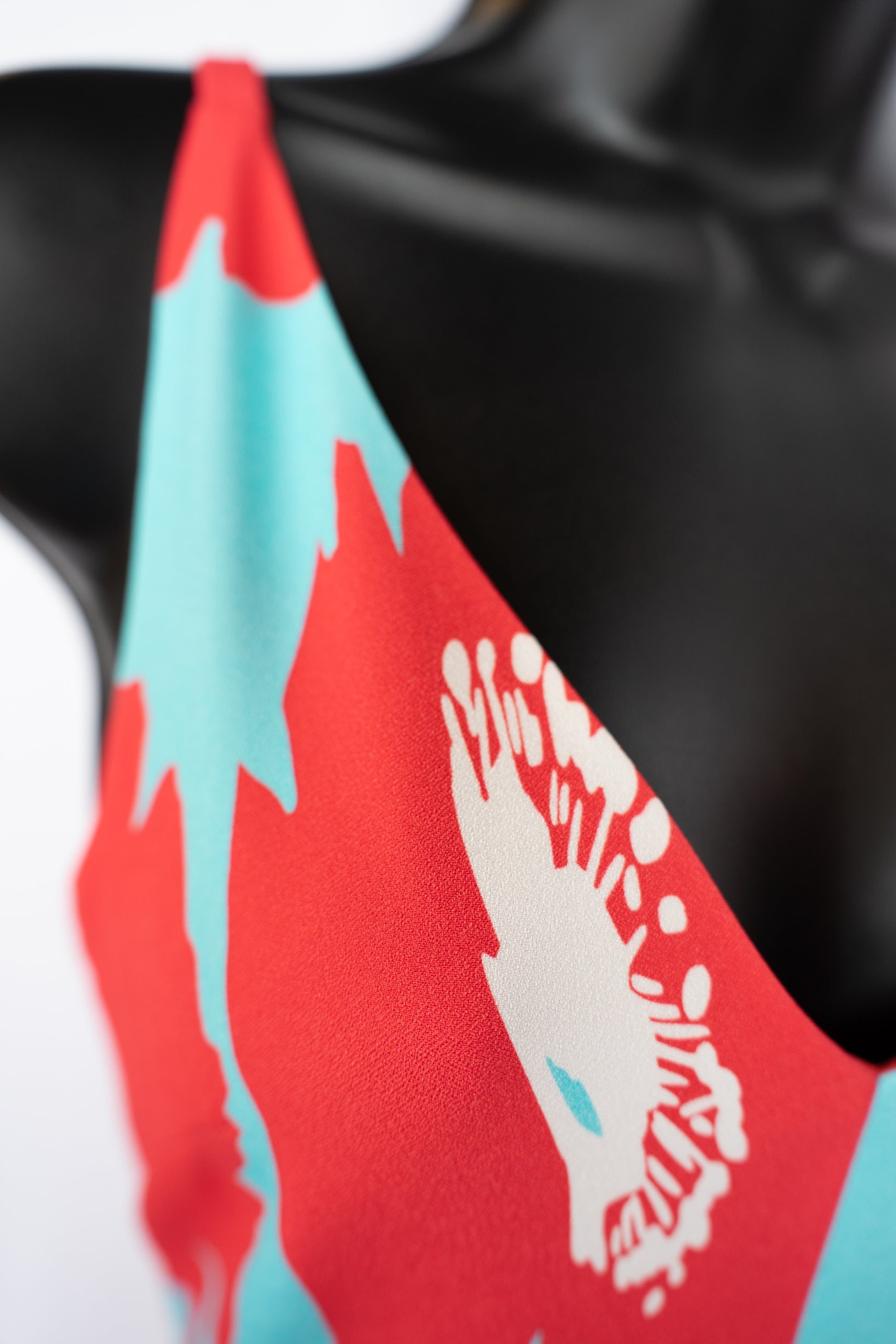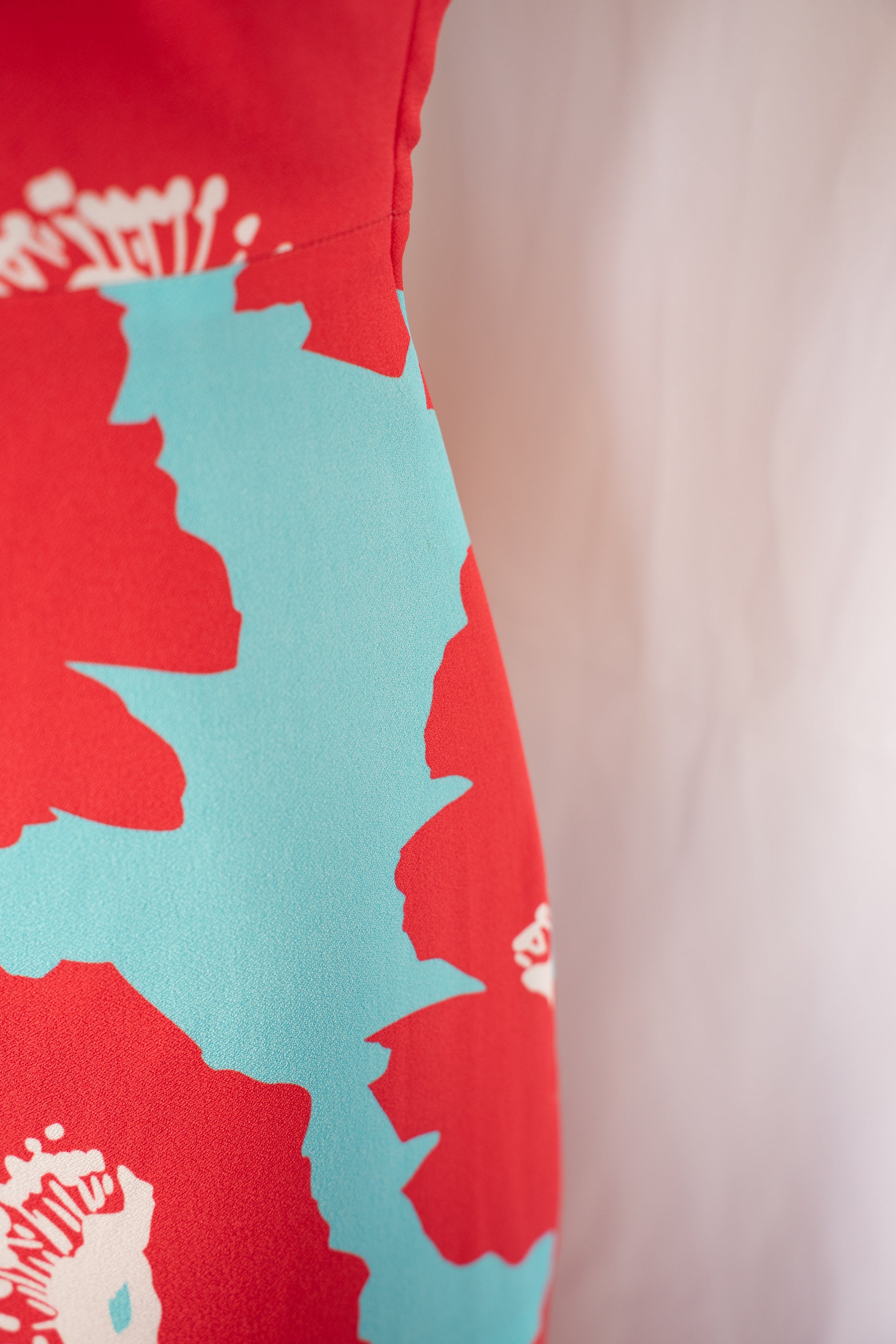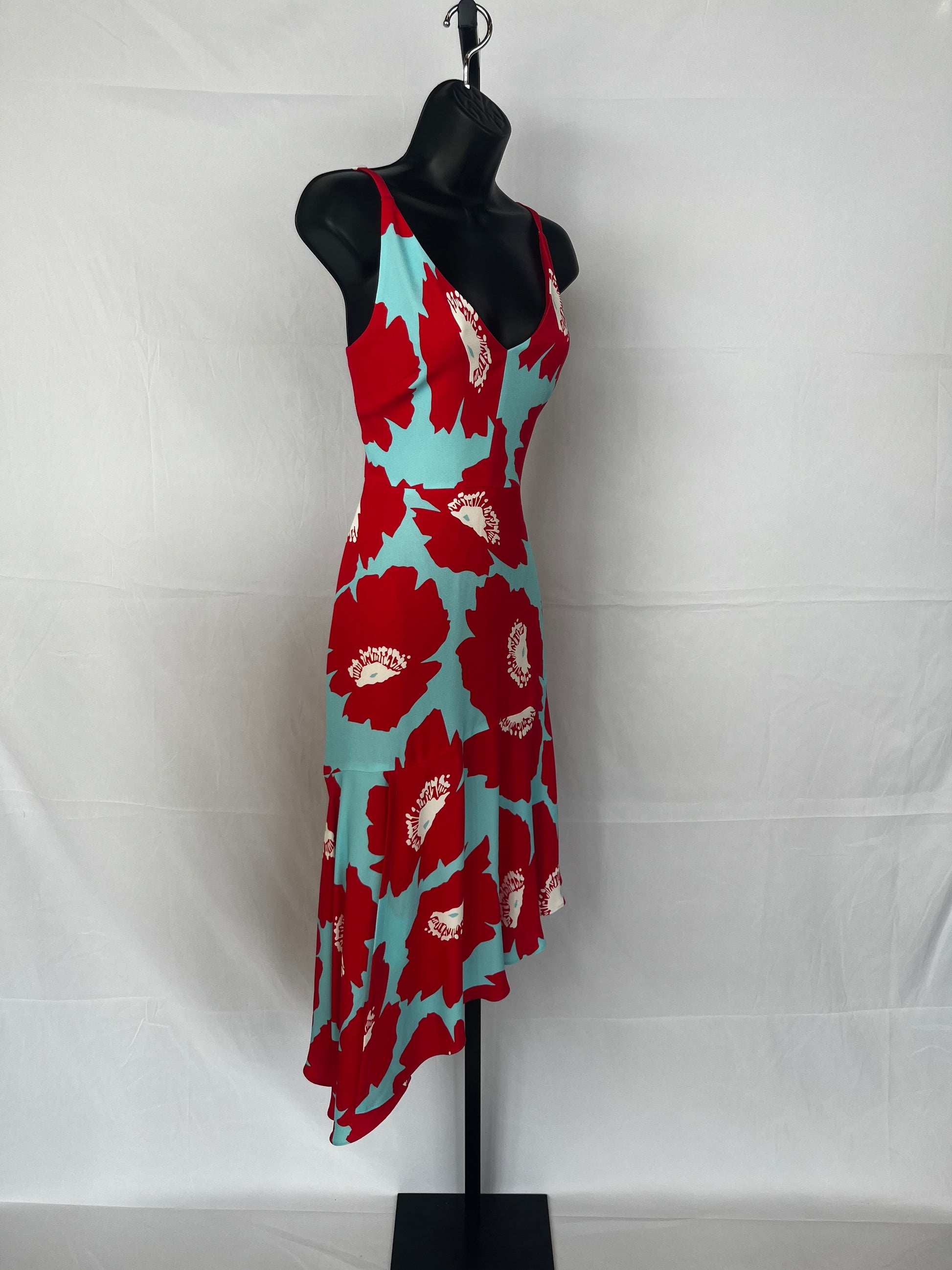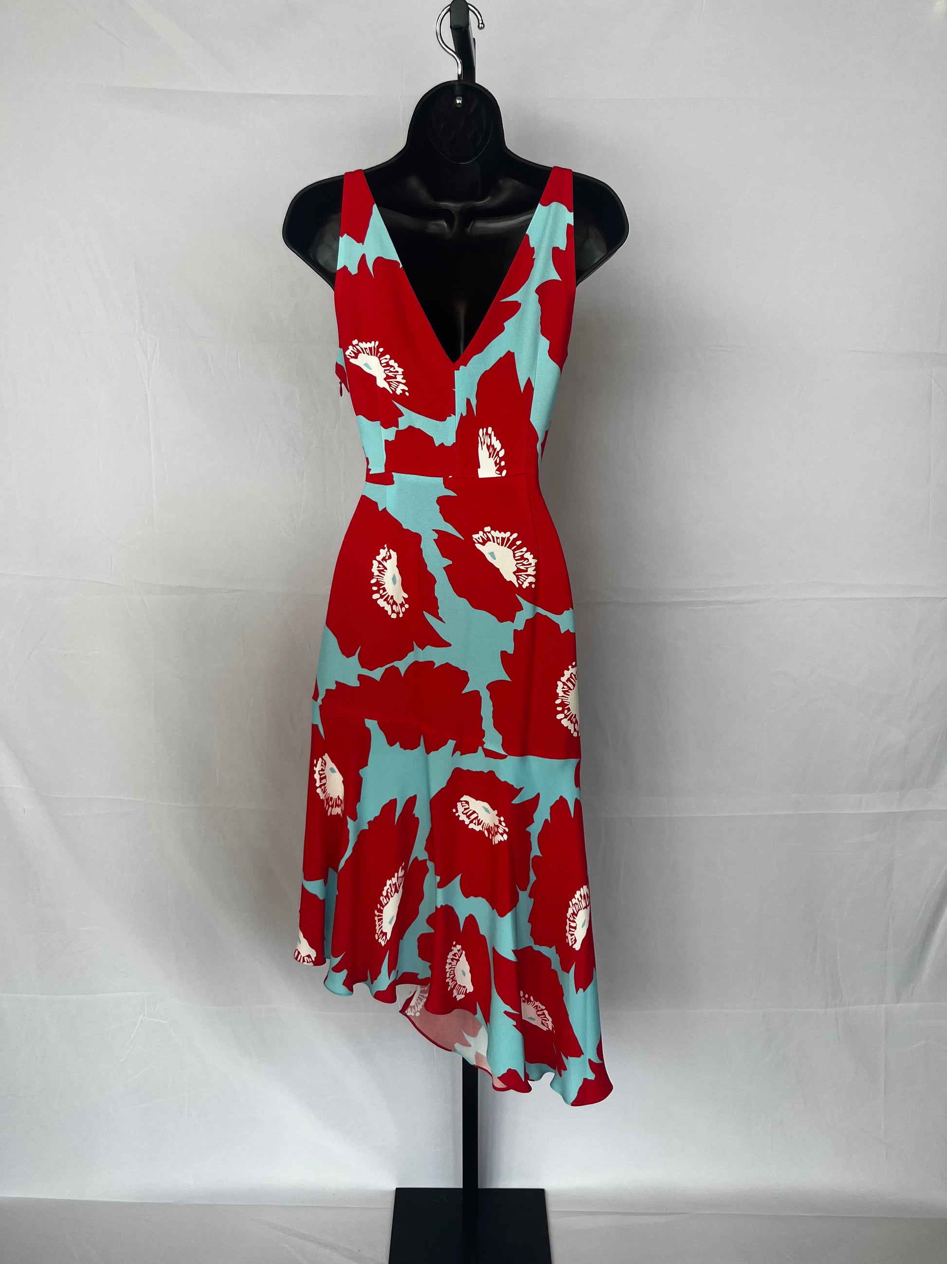 Milly Red & Blue Floral Print Asymmetrical Midi V-Neck Sleeveless Dress NWT