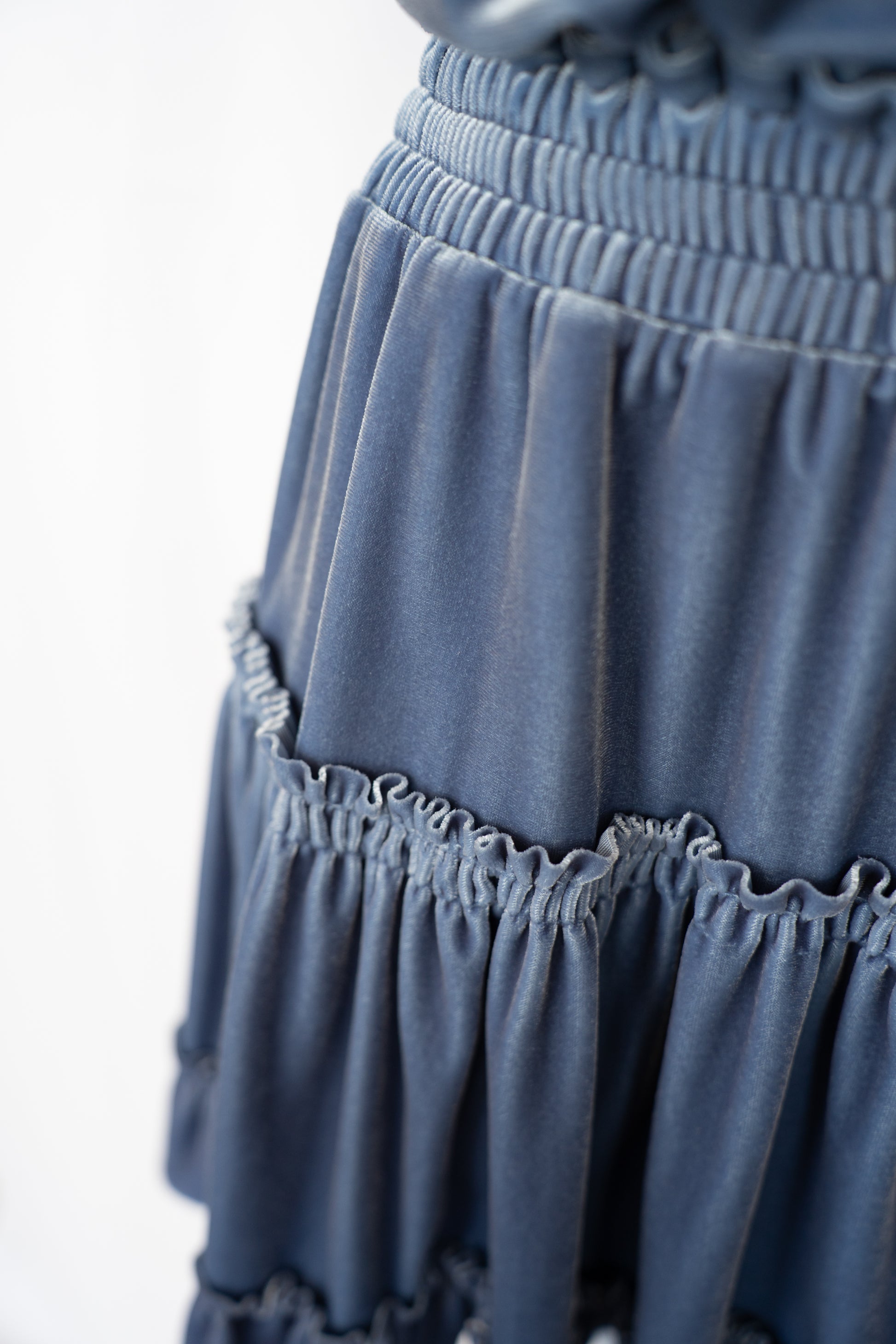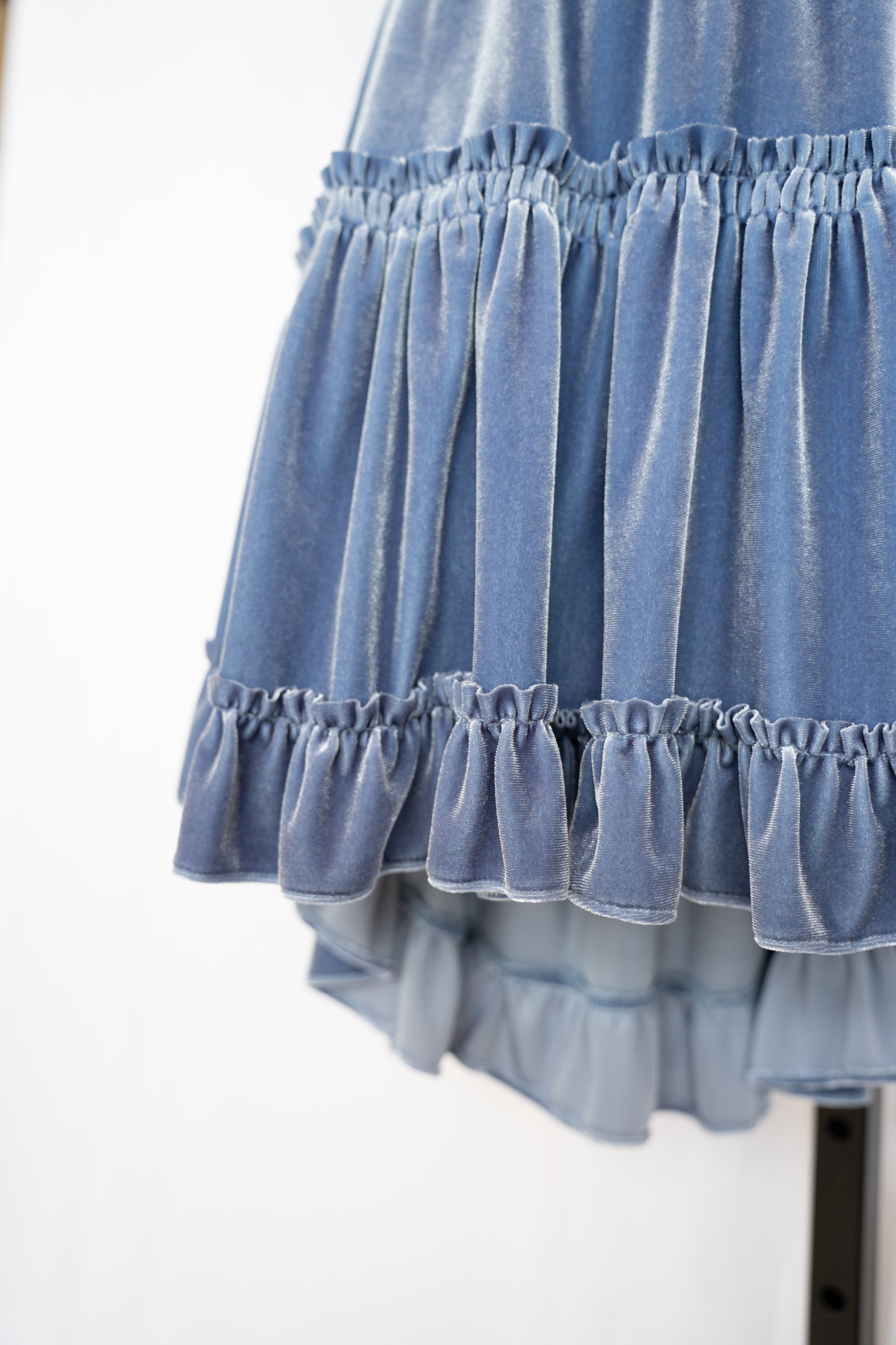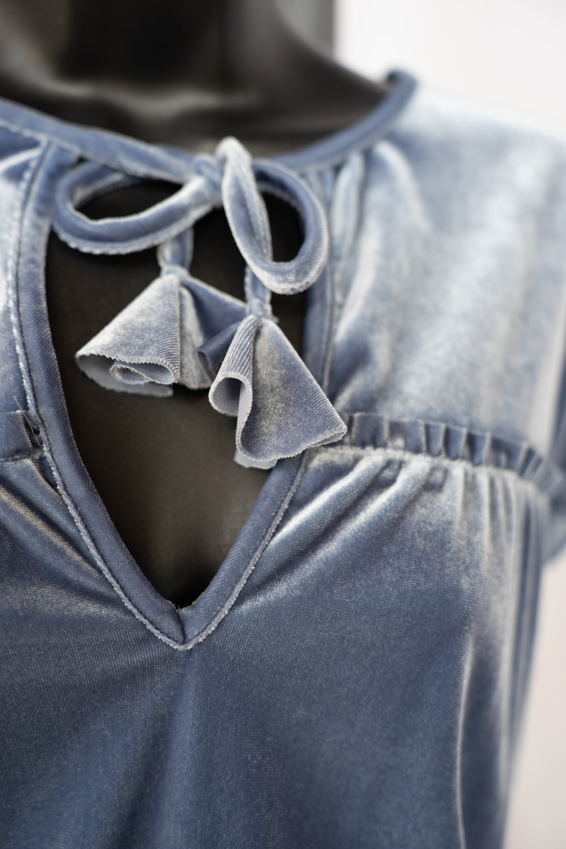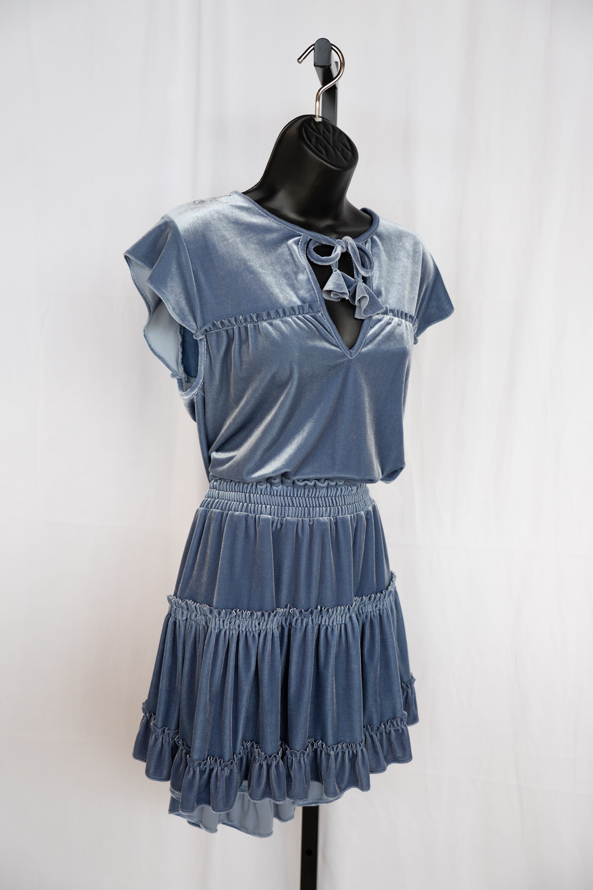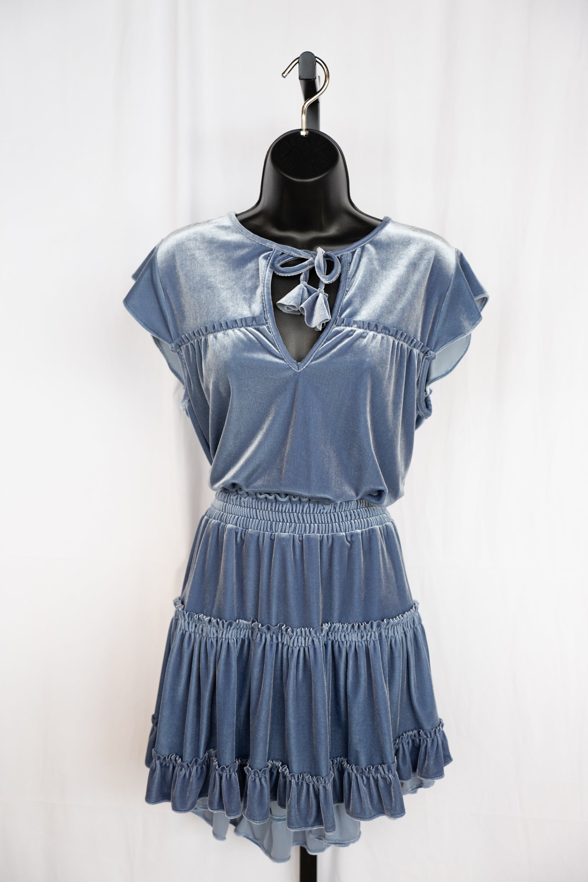 Misa Dusty Blue Velvet V-Neck w Tie Cap Sleeve Smocked Waist Mini Dress w Ruffles
