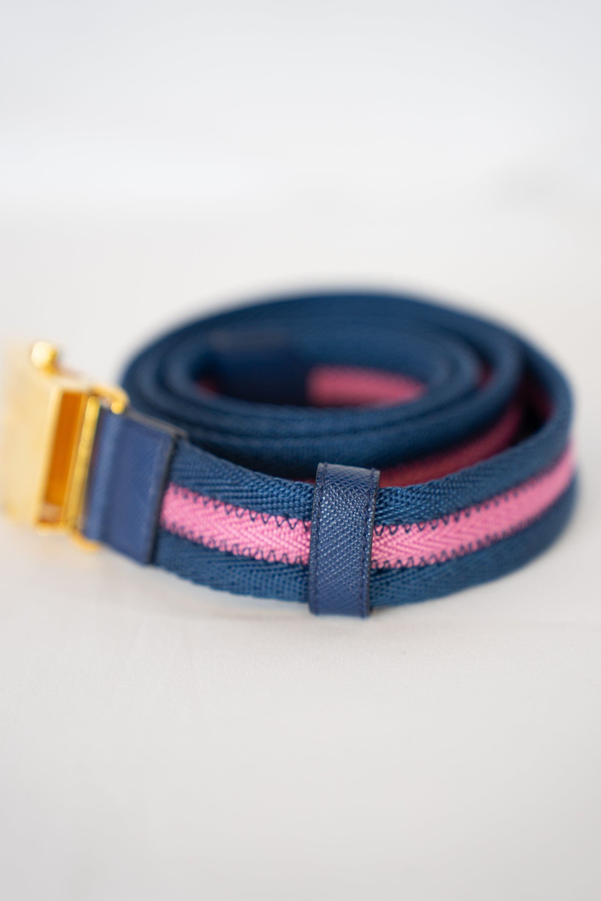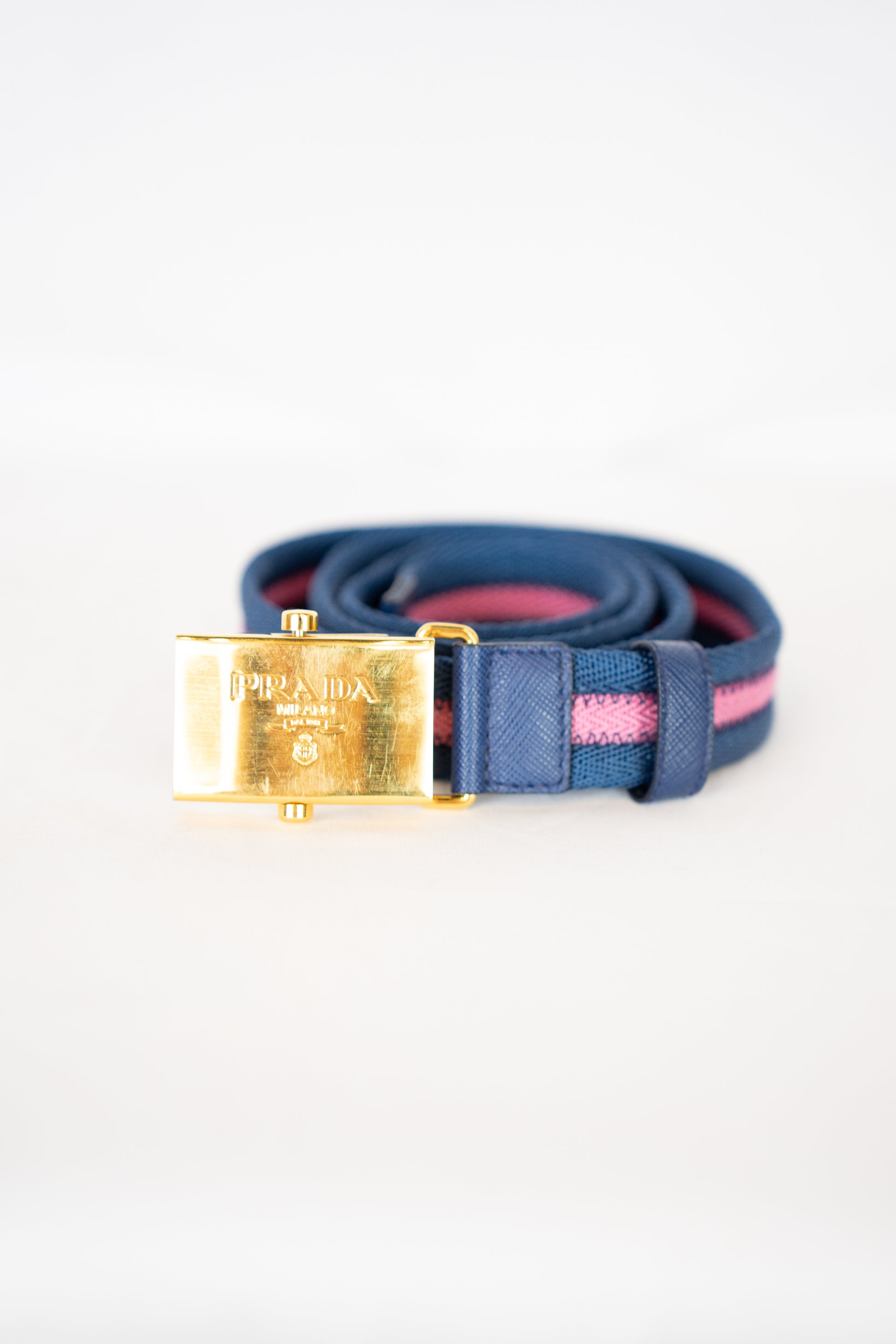 Prada Canvas Blue & Pink Stripe Skinny Belt w Gold Clasp Closure Buckle