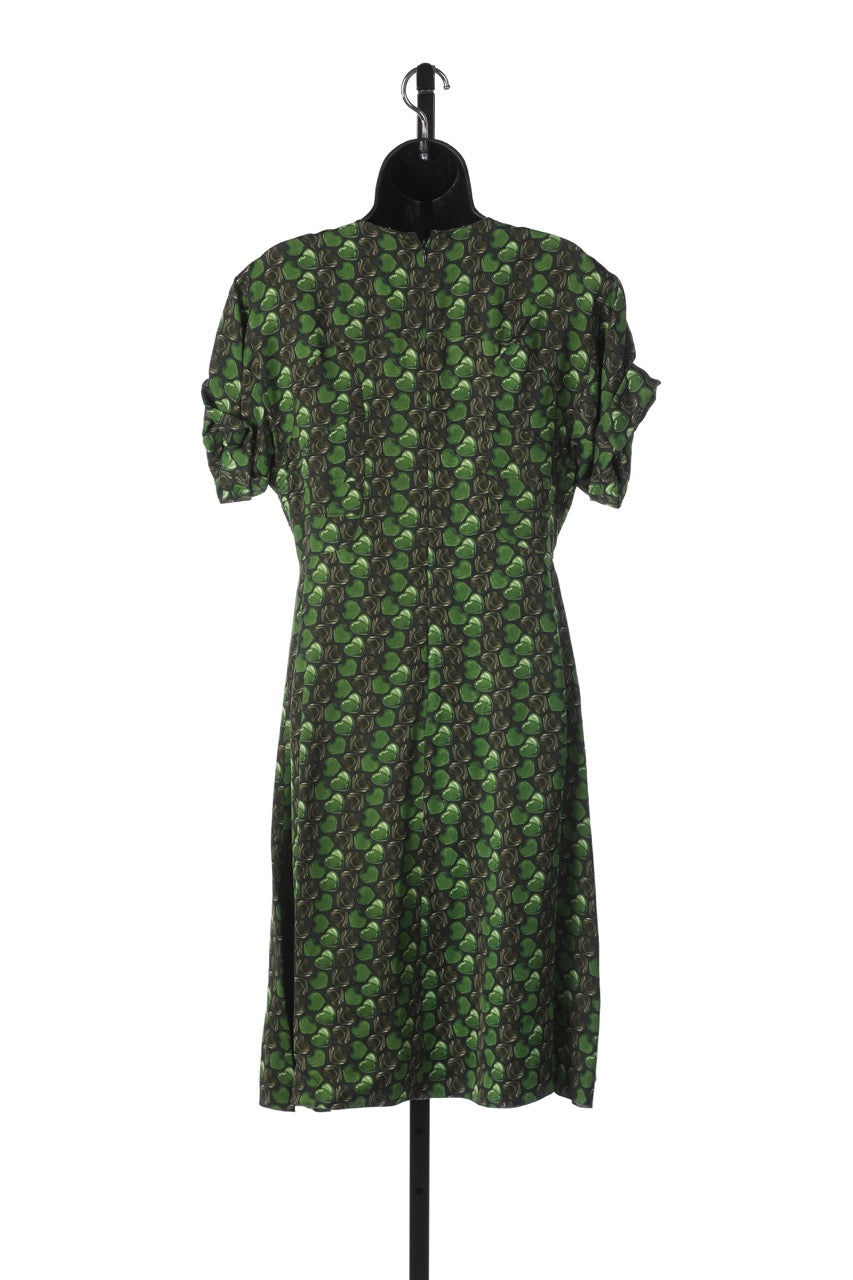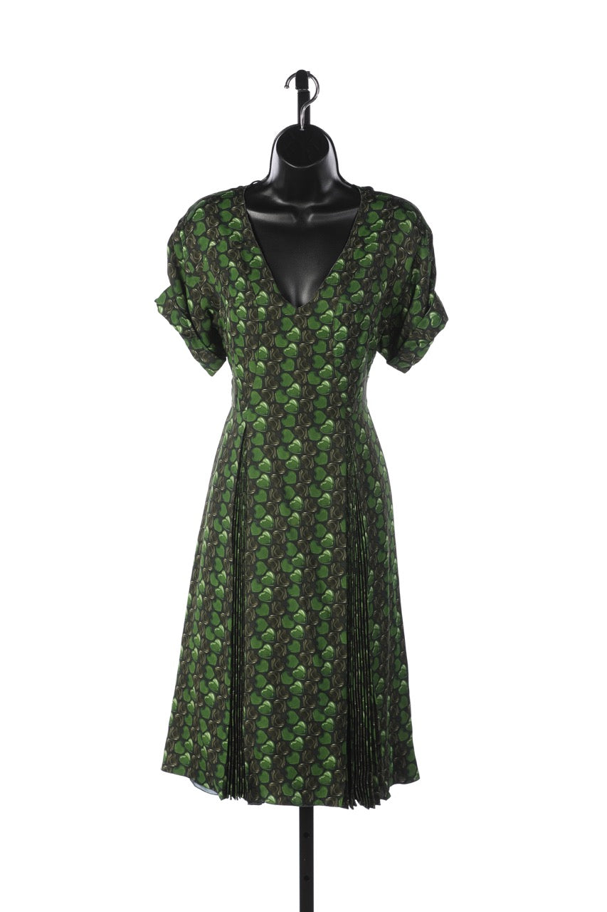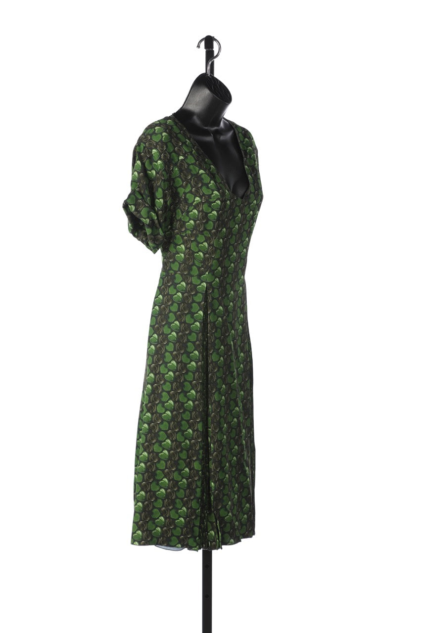 Prada Green Short-sleeve V-Neck Dress w/ Heart-Shaped Print