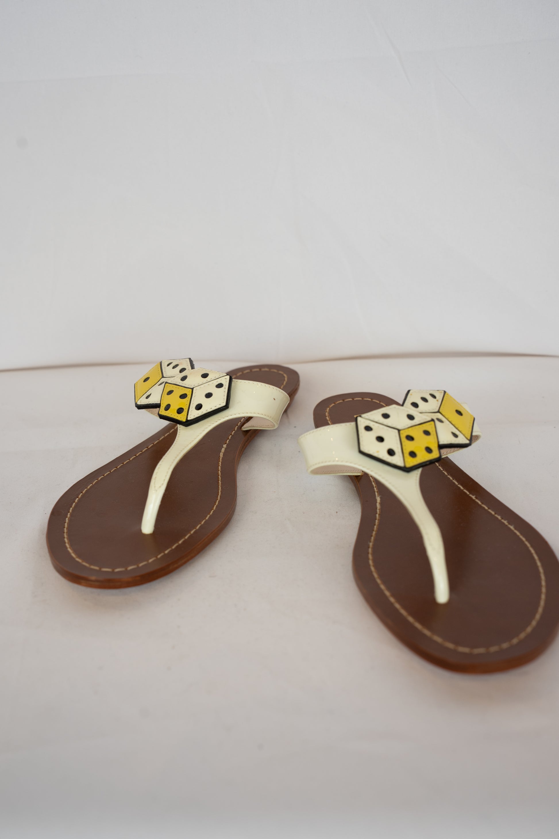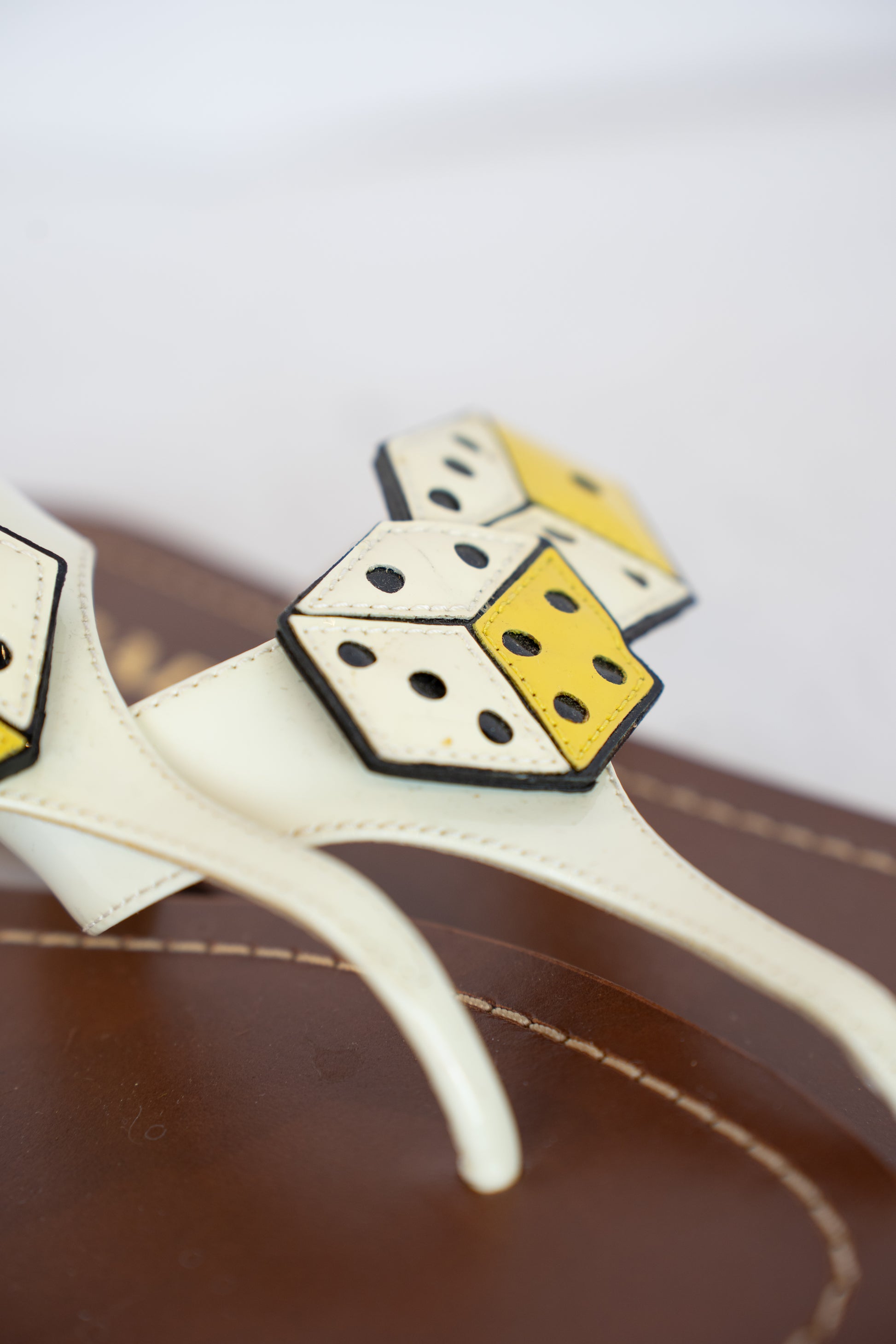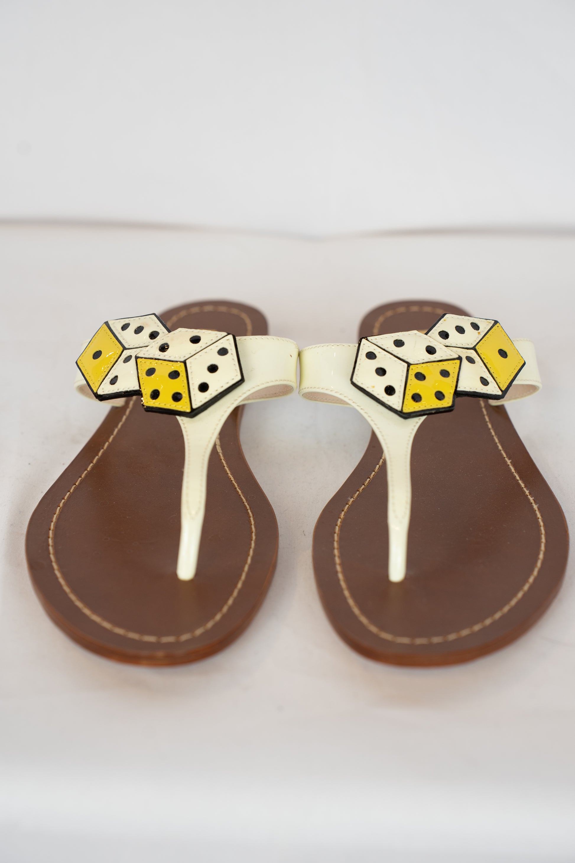 Prada White & Yellow Dice Patent Leather T-strap Sandals