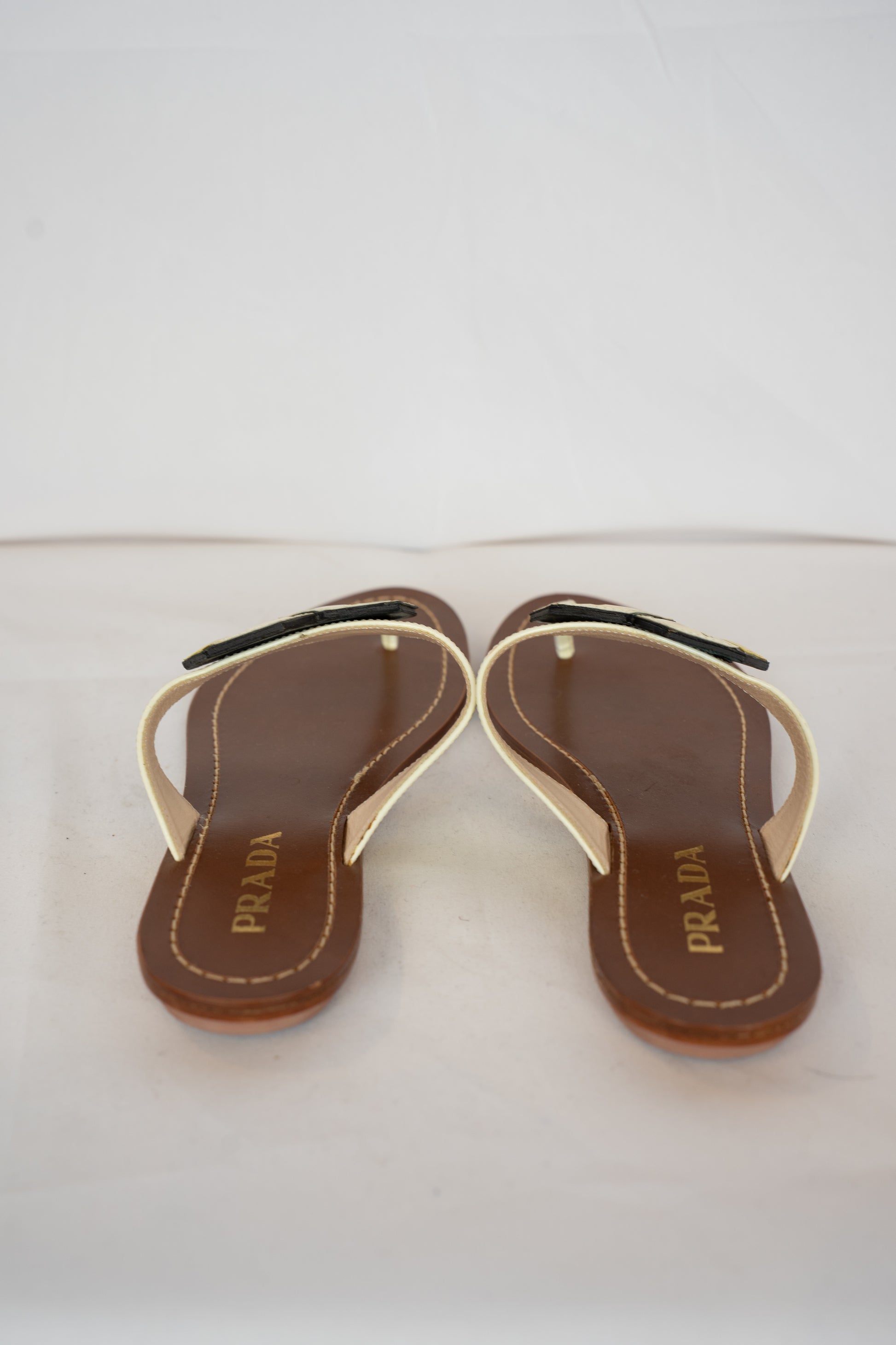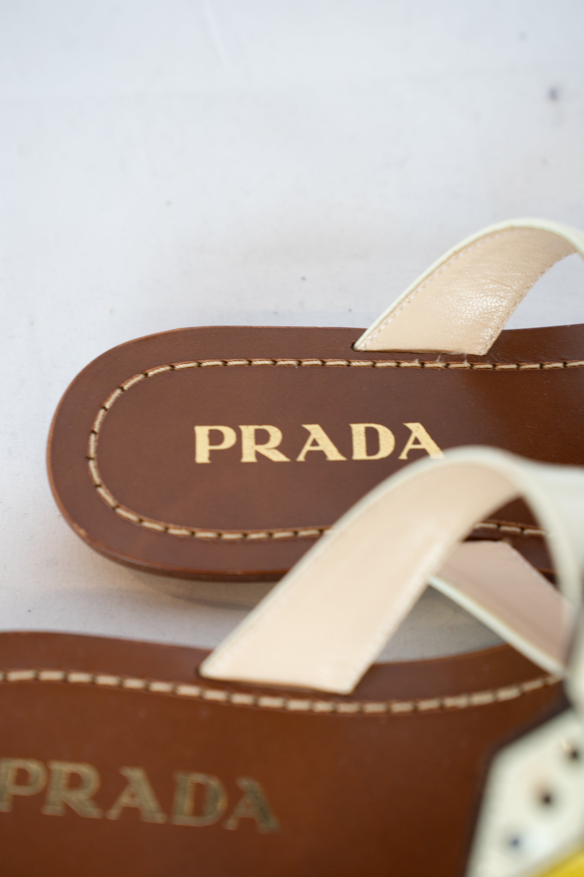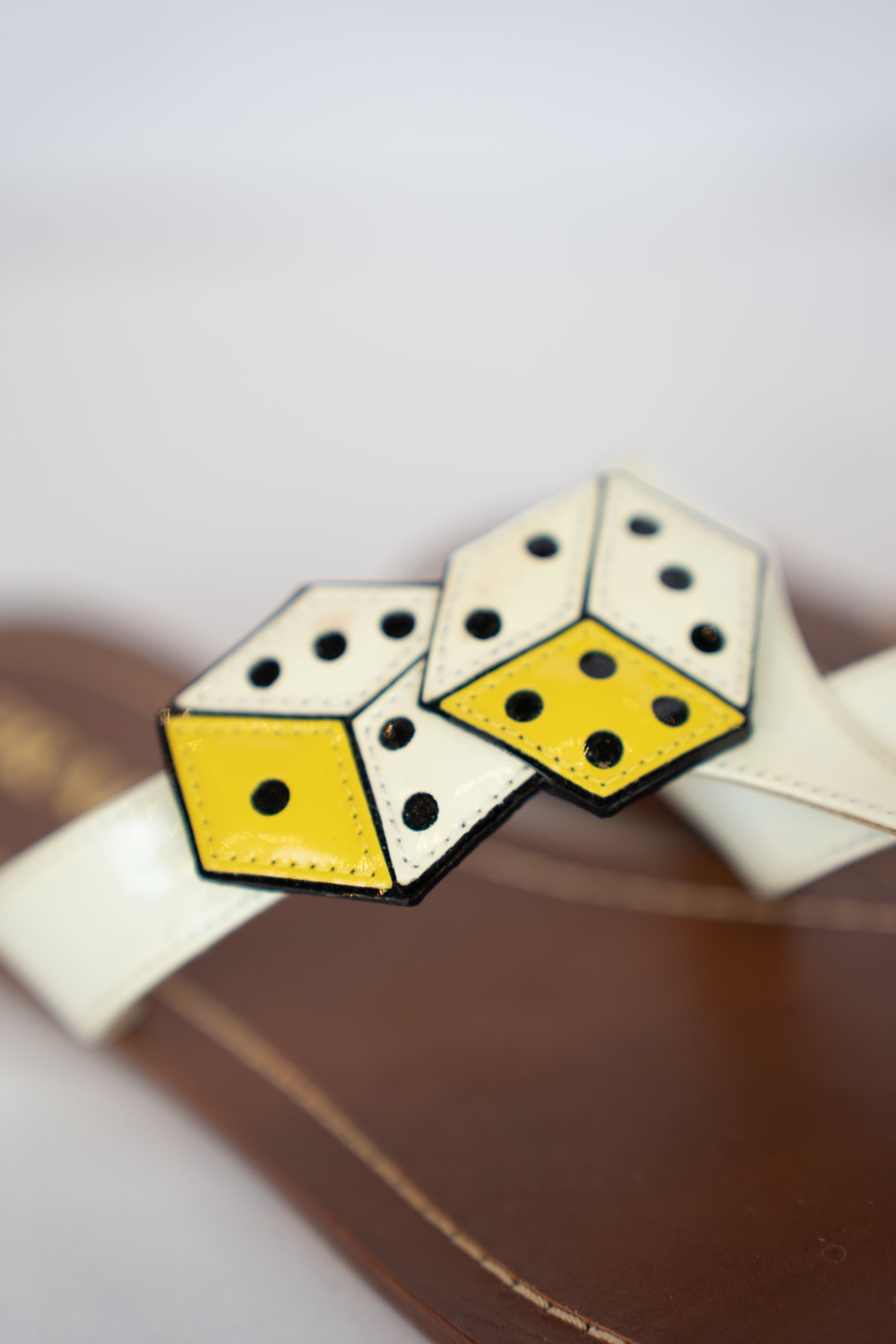 Prada White & Yellow Dice Patent Leather T-strap Sandals