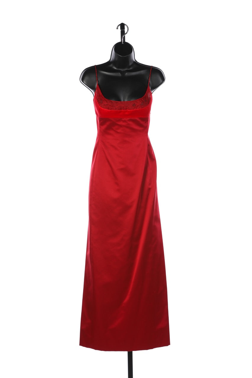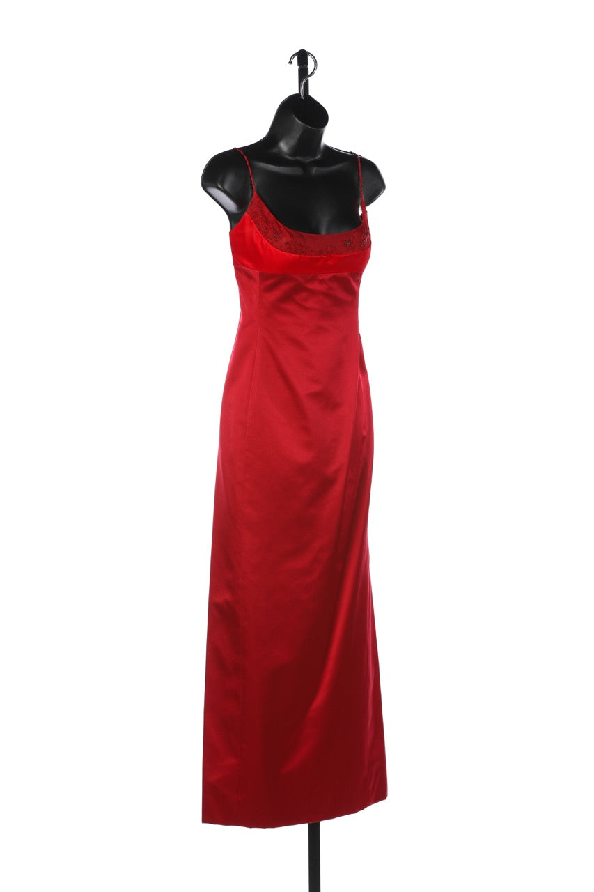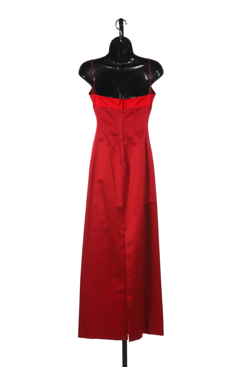Richard Tyler Couture Silk Red Sleeveless Chiffon Beaded Neck-Line Fitted Full-Length Gown