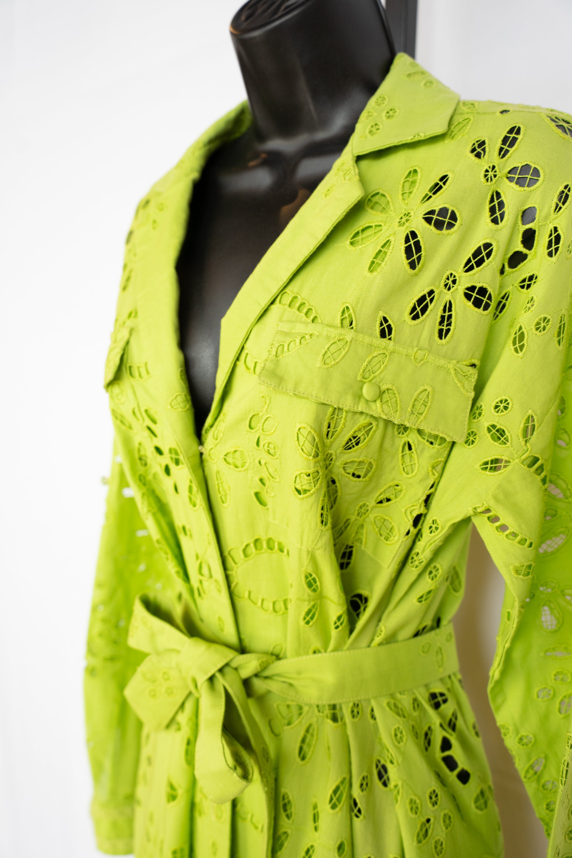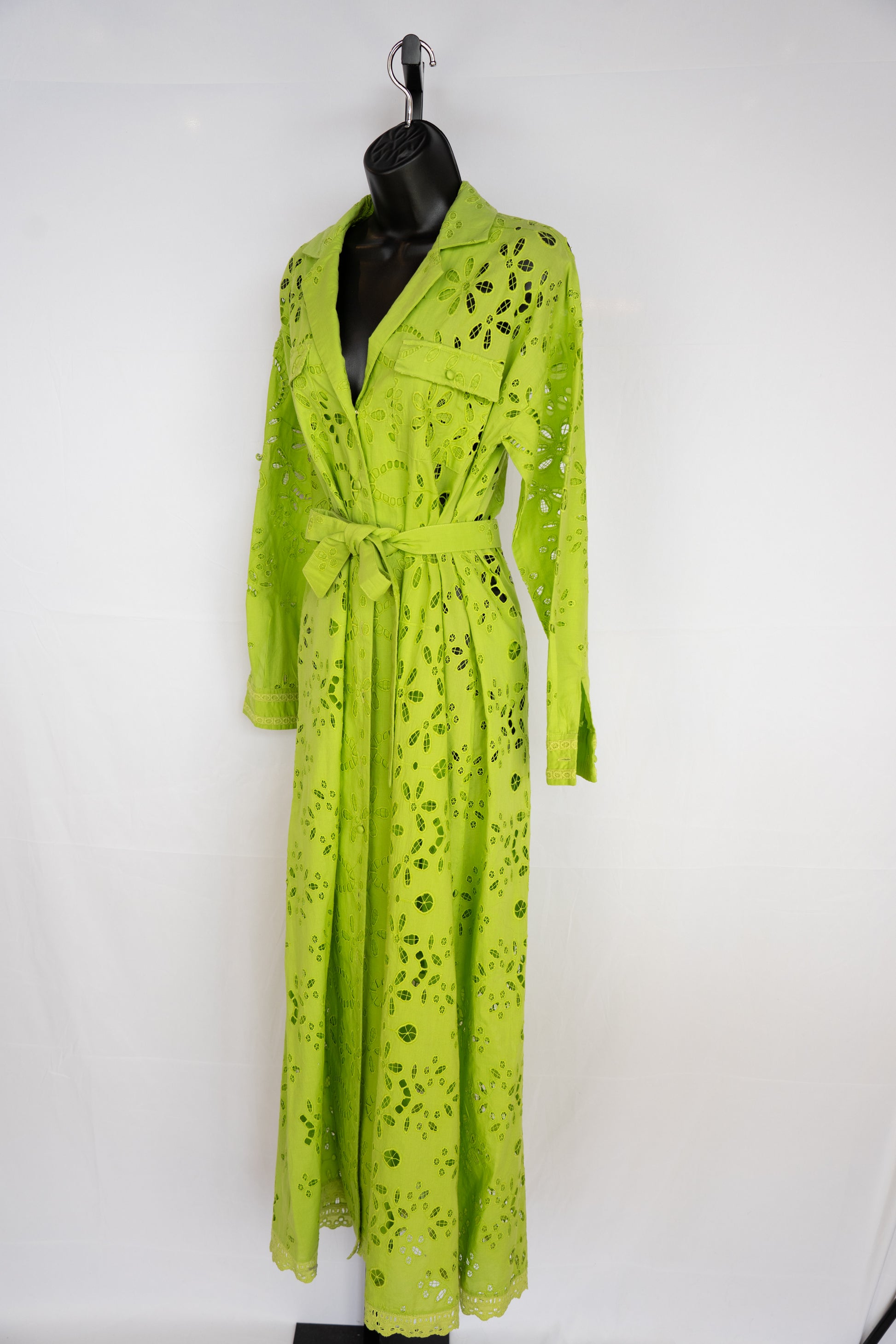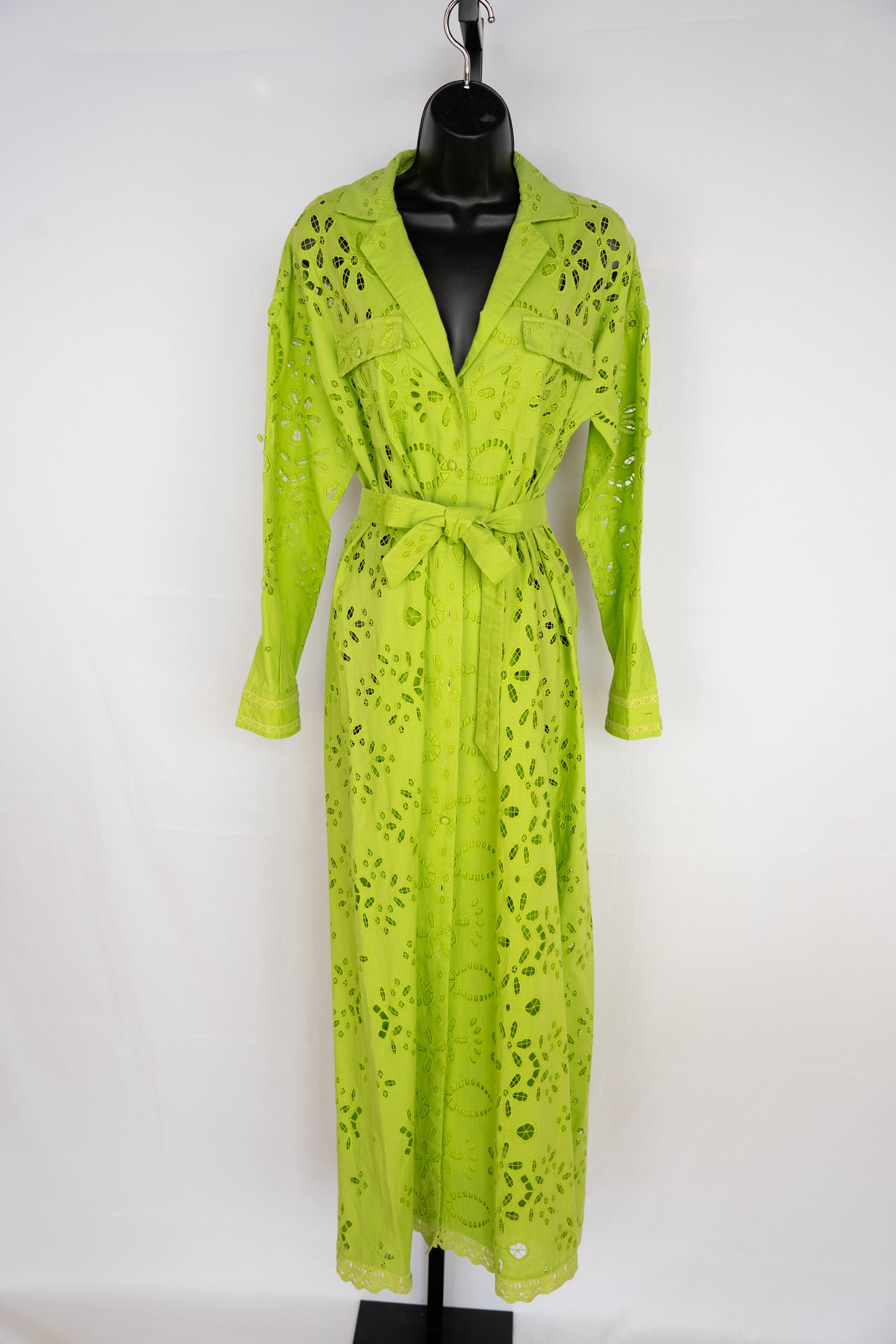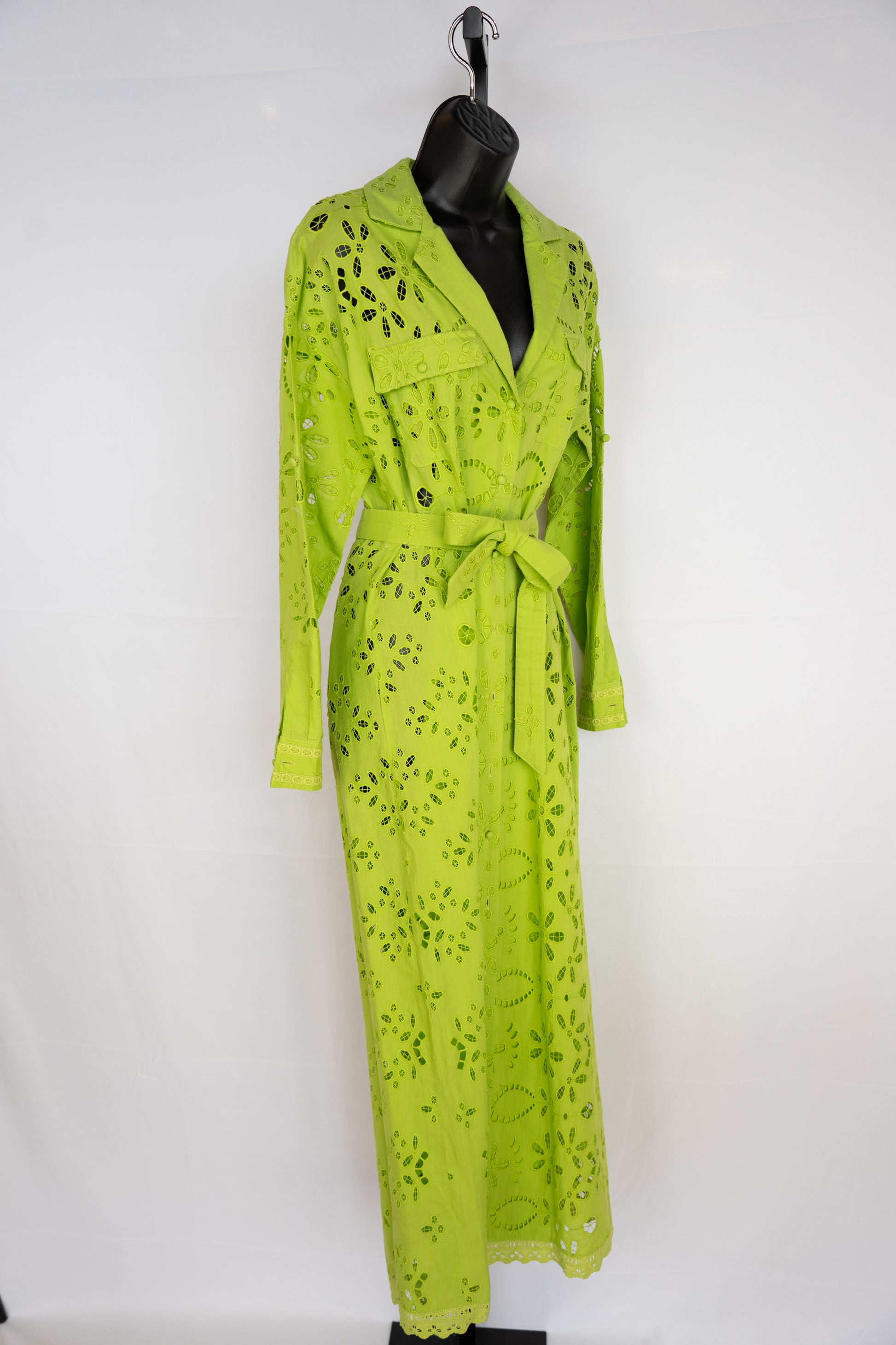 Rococo Light Green Floral Crochet Collared Long Sleeve Button Up Maxi Dress w Belt