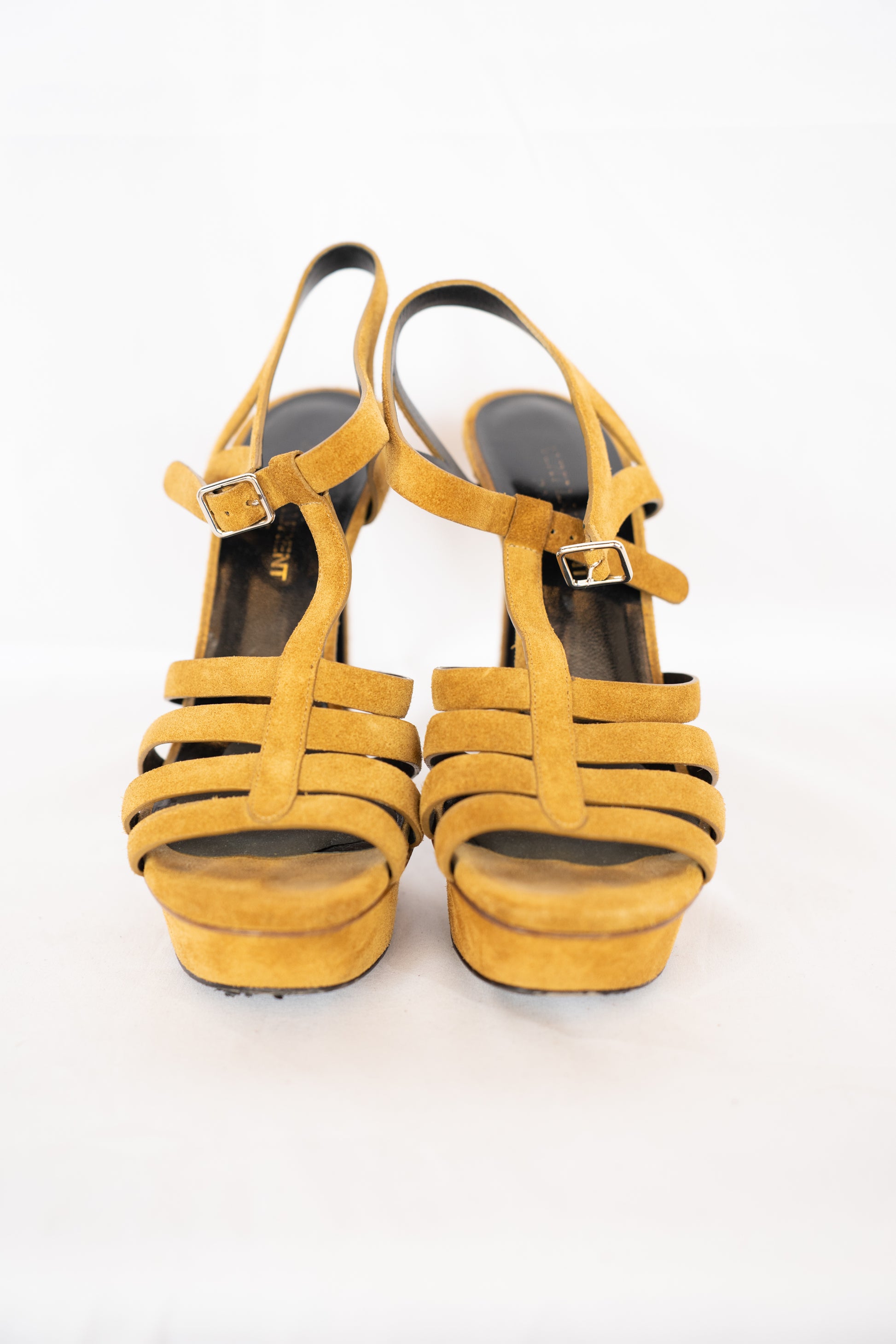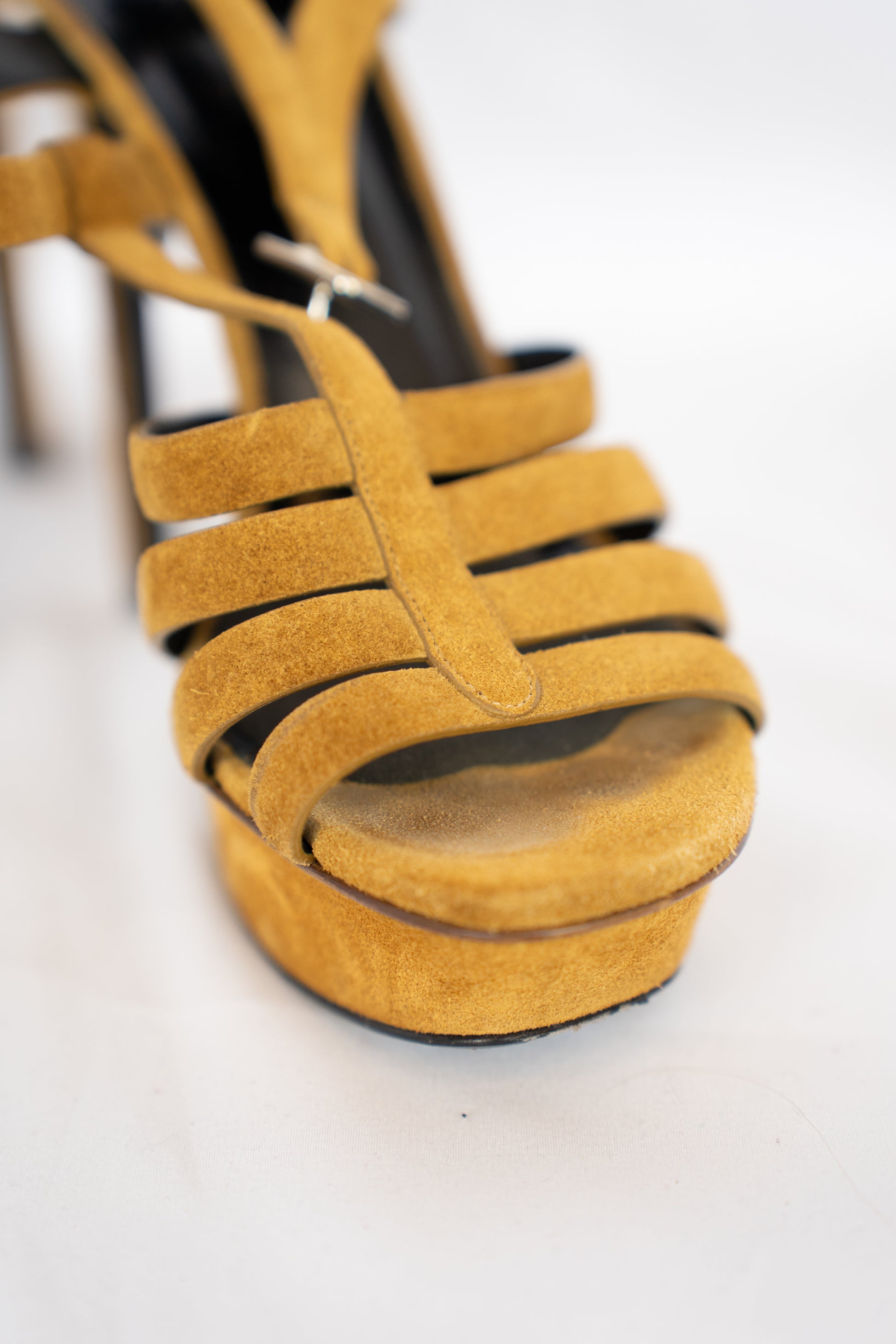 Saint Laurent Brown Suede Open Toe Strappy Ankle Buckle Heels