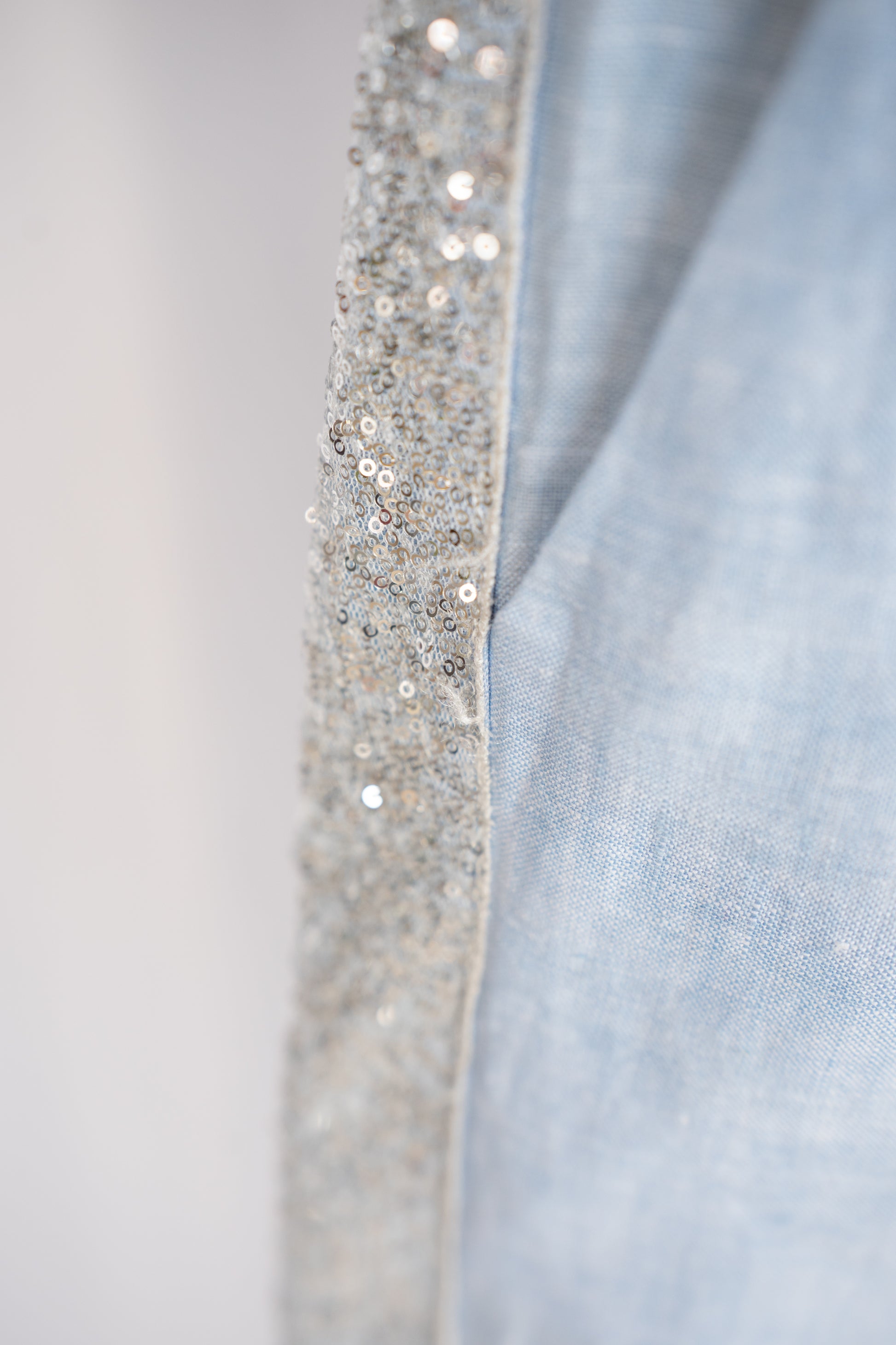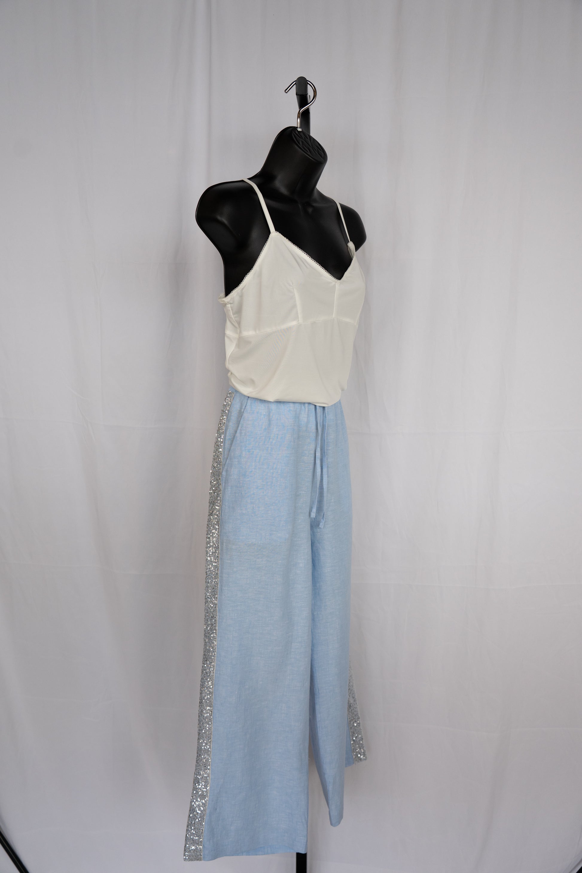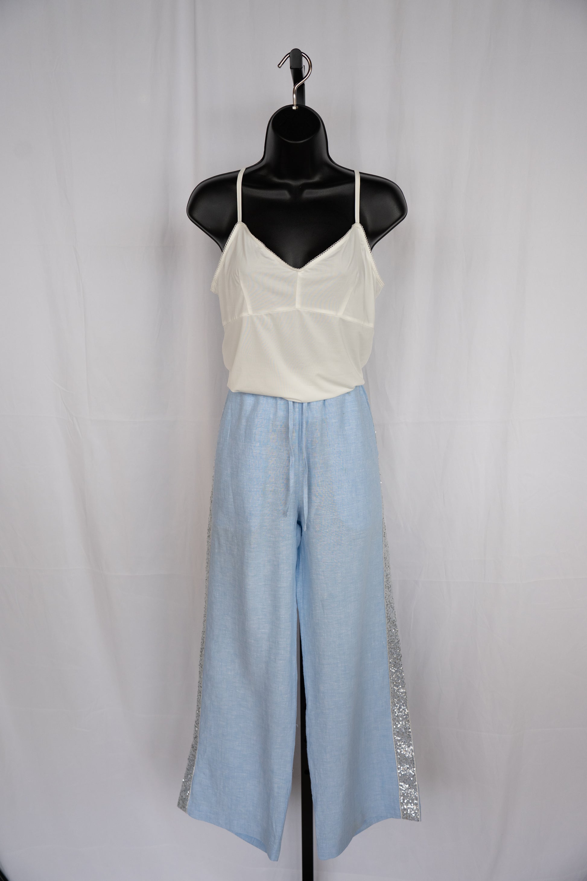 Saks Fifth Avenue Linen Light Blue w Side Silver Sequin Relaxed Fit Pants