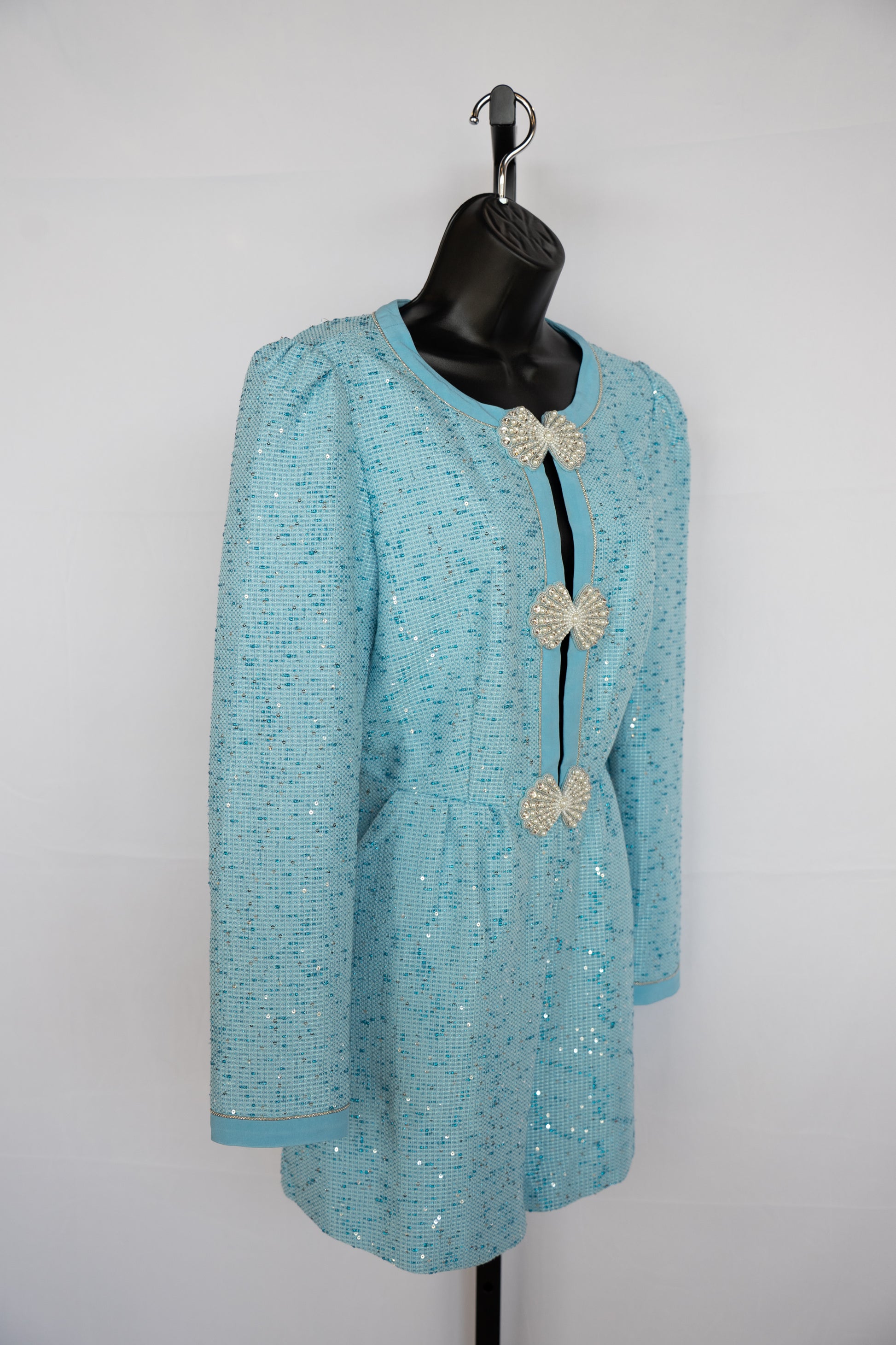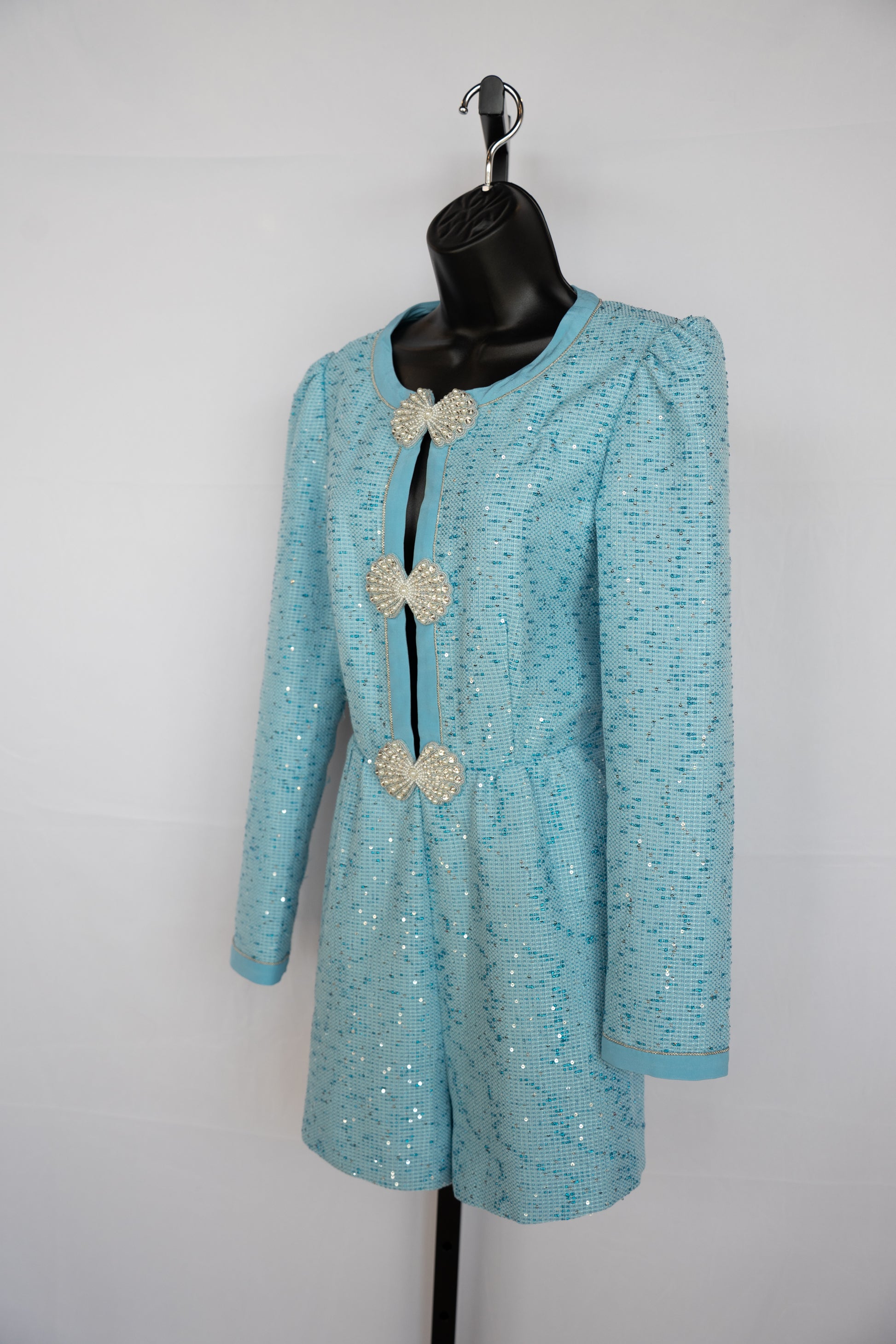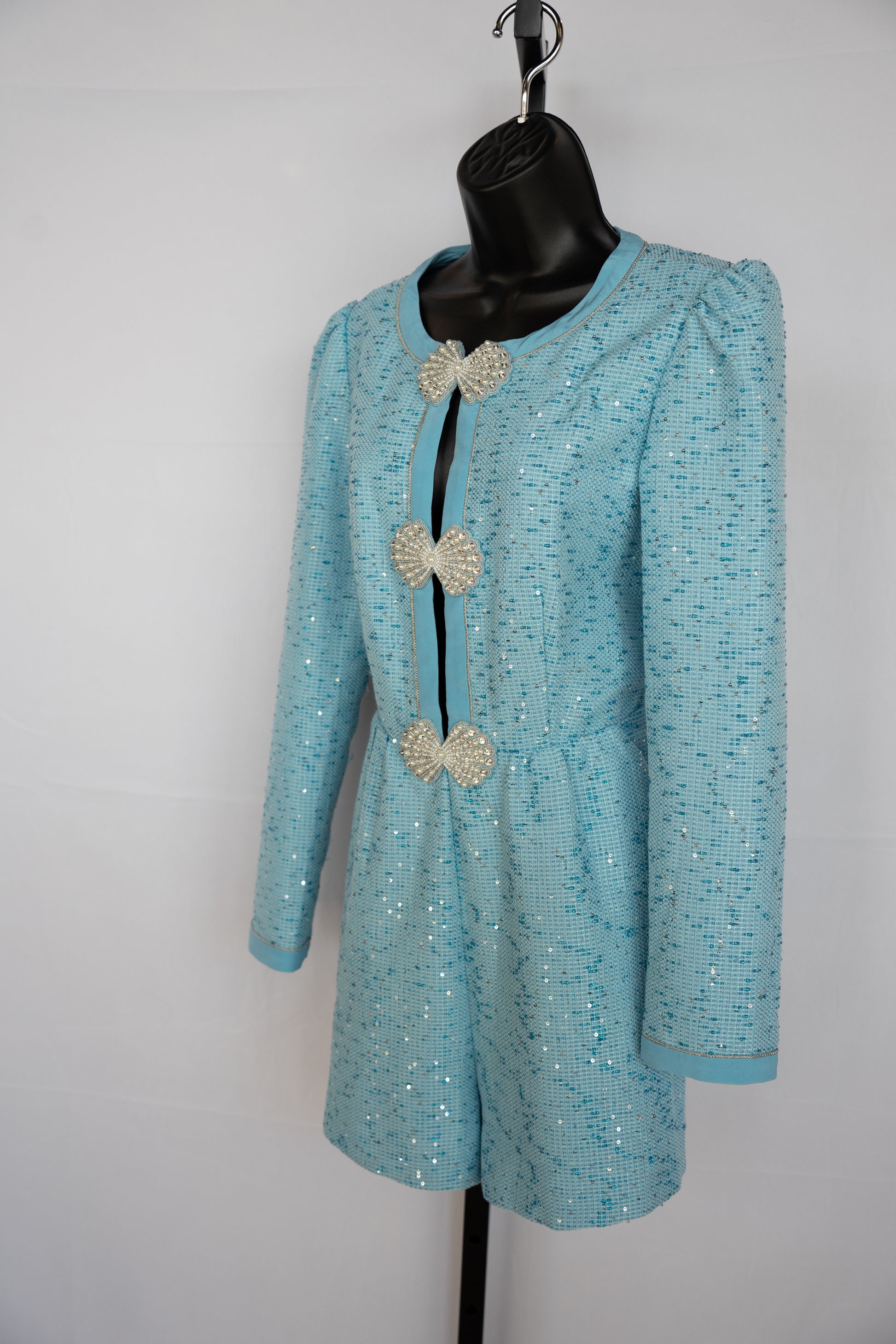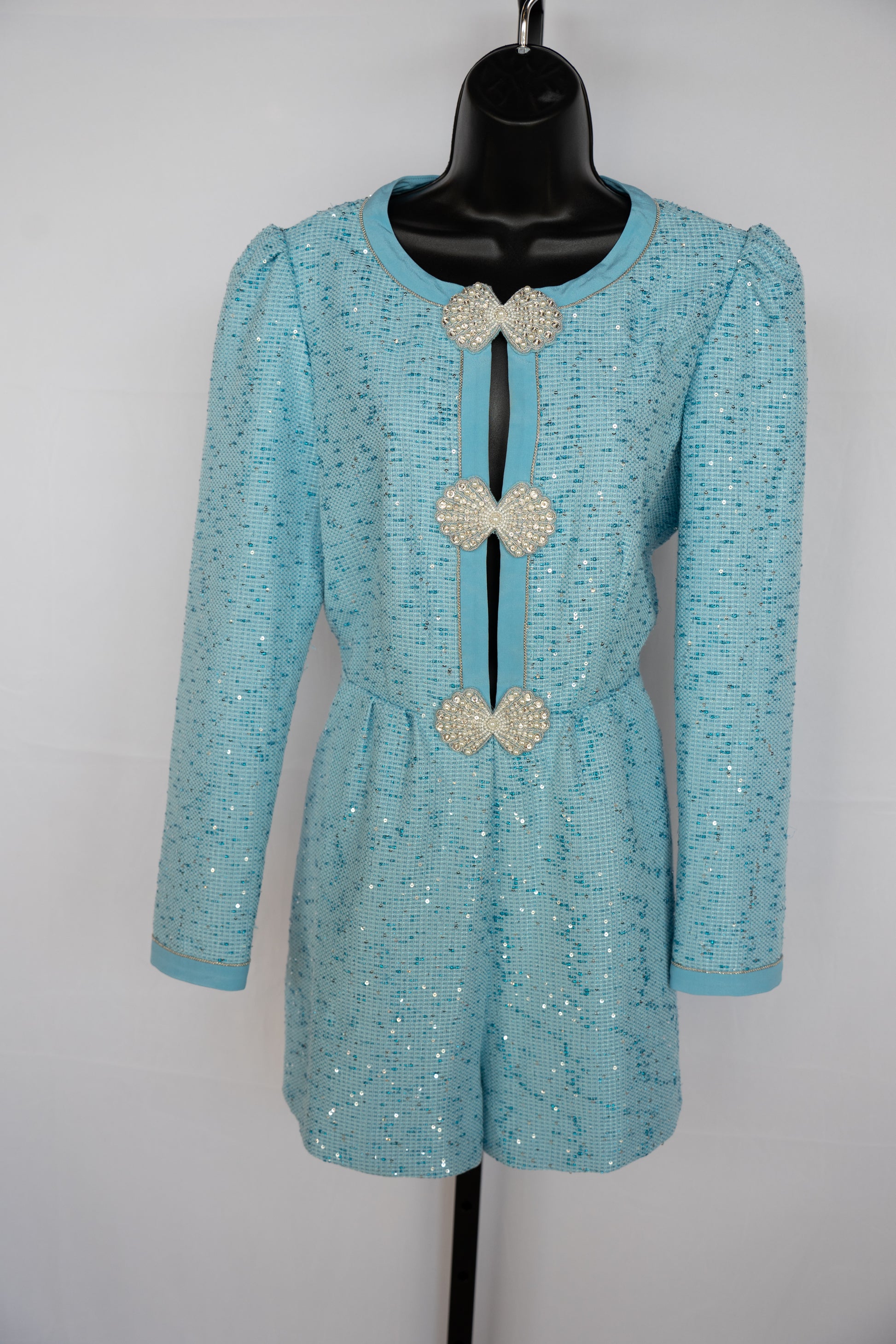 Saloni Blue Tweed Long Sleeve Romper w/ Beaded Details