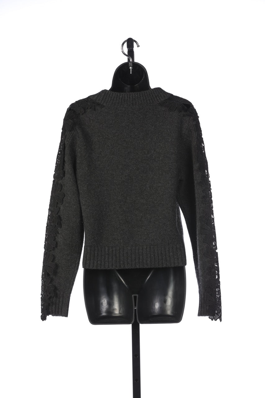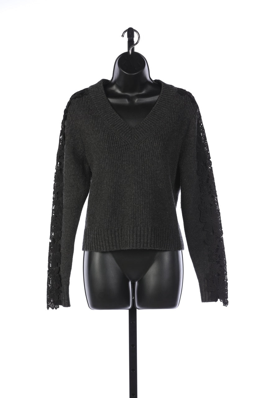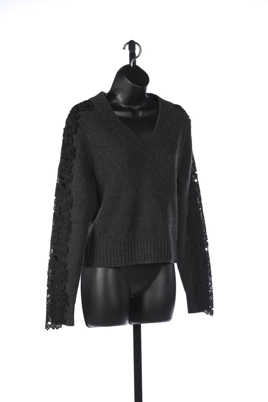 See By Chloe Dark Grey V-Neck Sweater with Black Floral Lace Detail on Sleeves