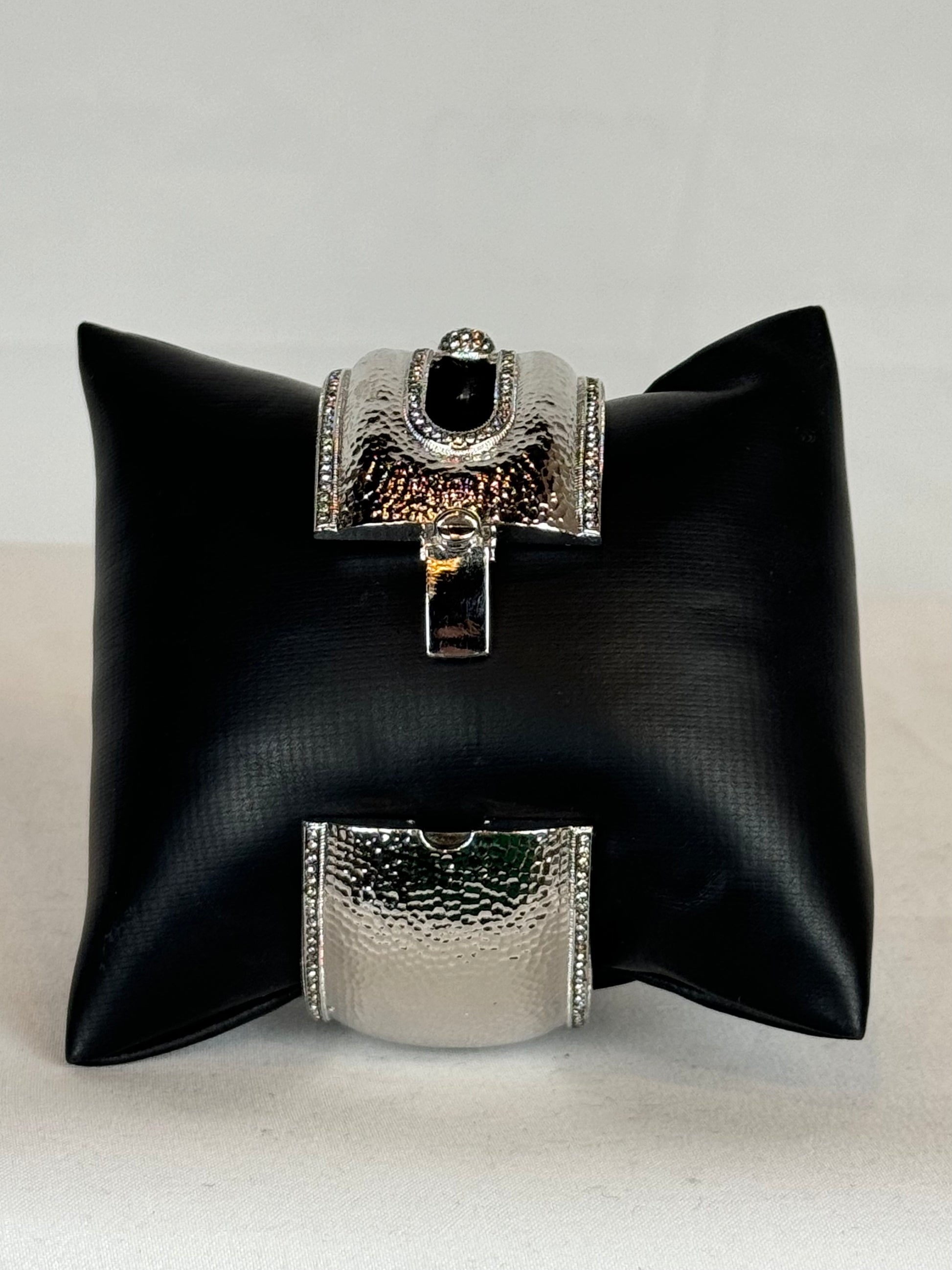 Silver Tone Metal Hinge Cuff Bracelet w Hammered Texture & Crystal Accent