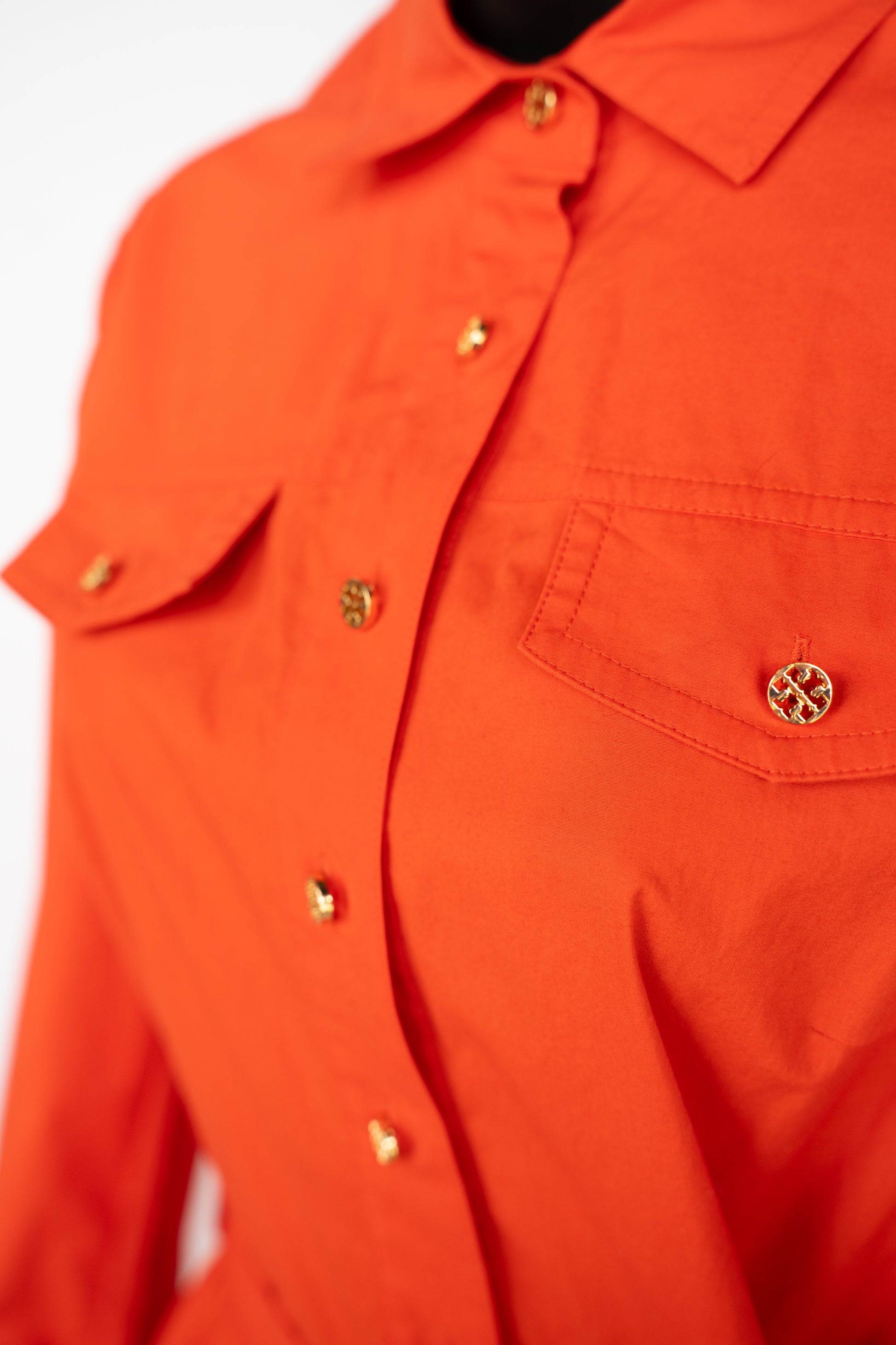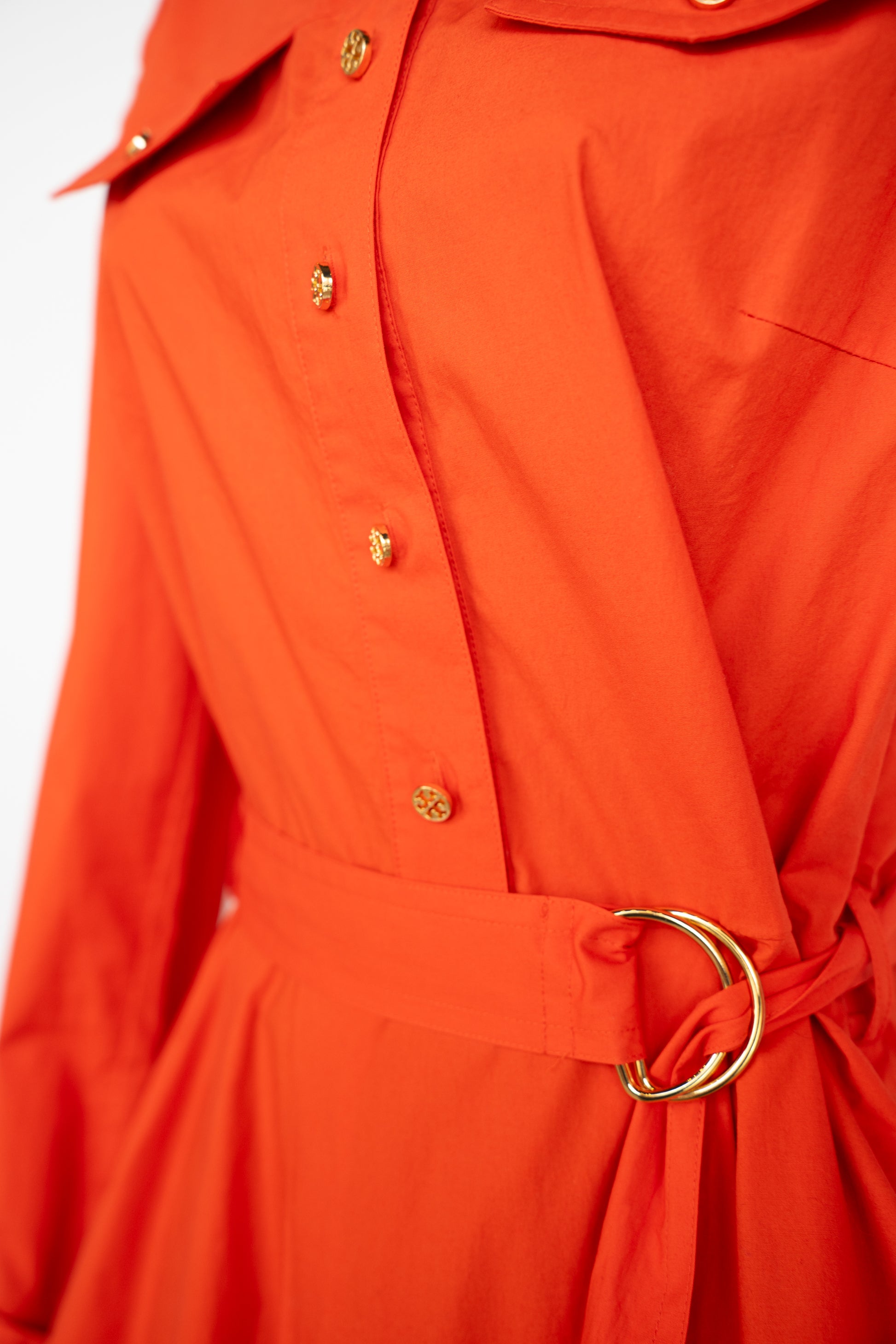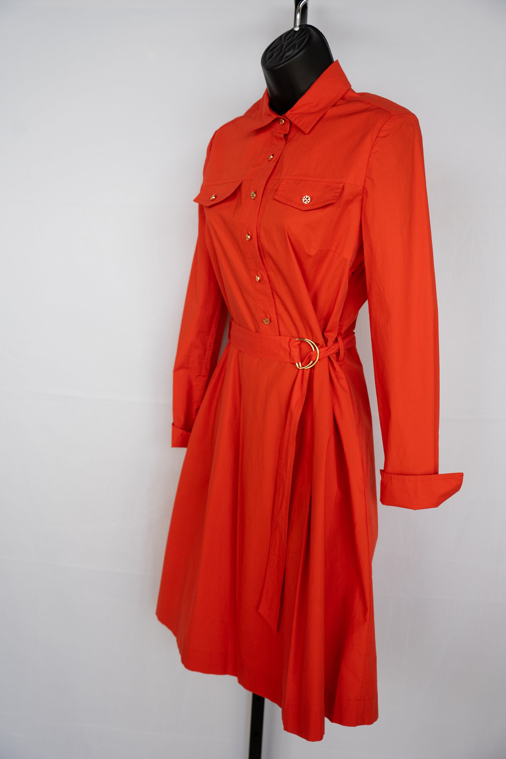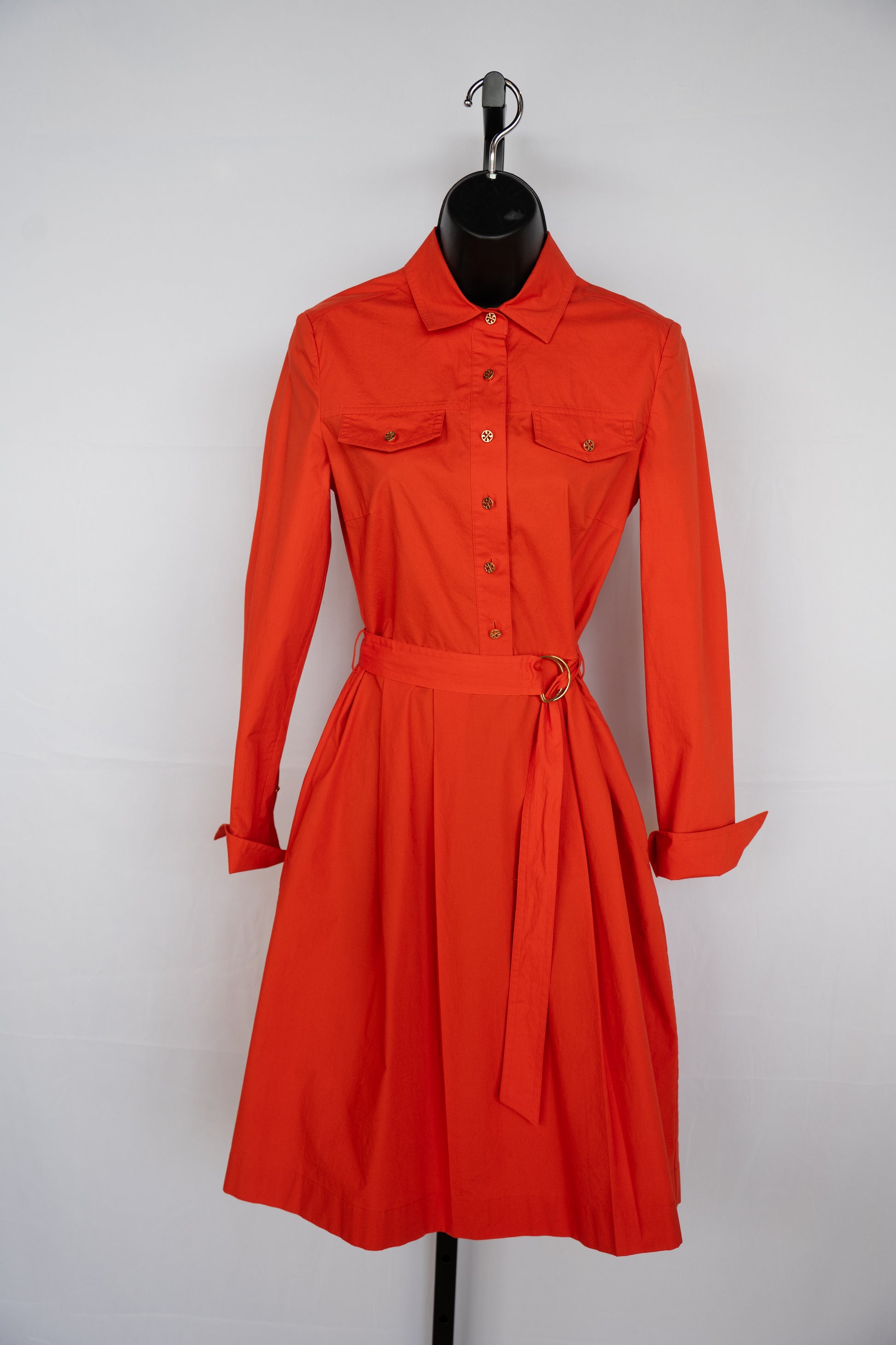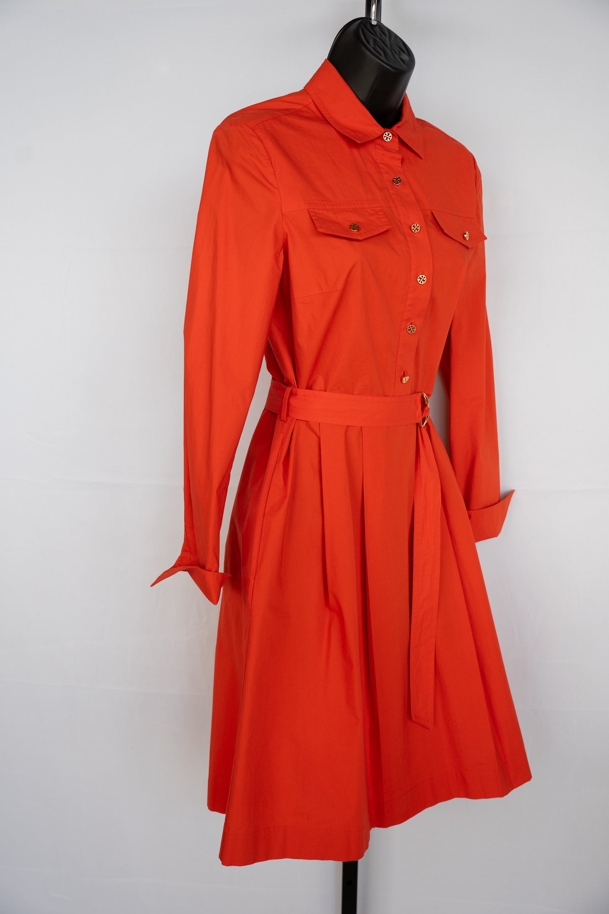Tory Burch Orange Long Sleeve Gold Button Up Knee-Length Dress w Pleated Skirt & Belt