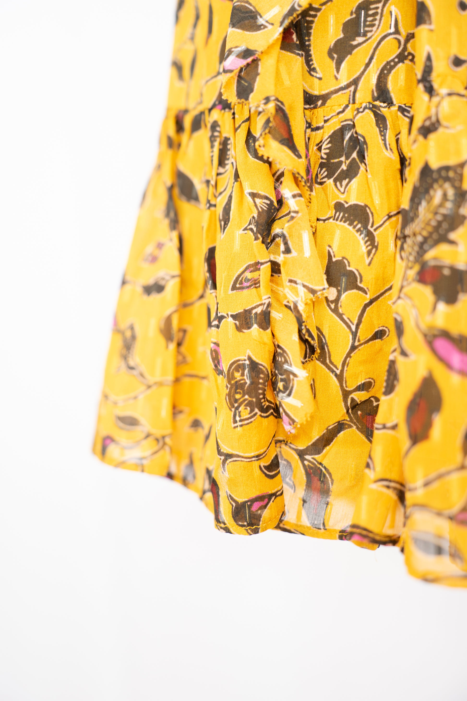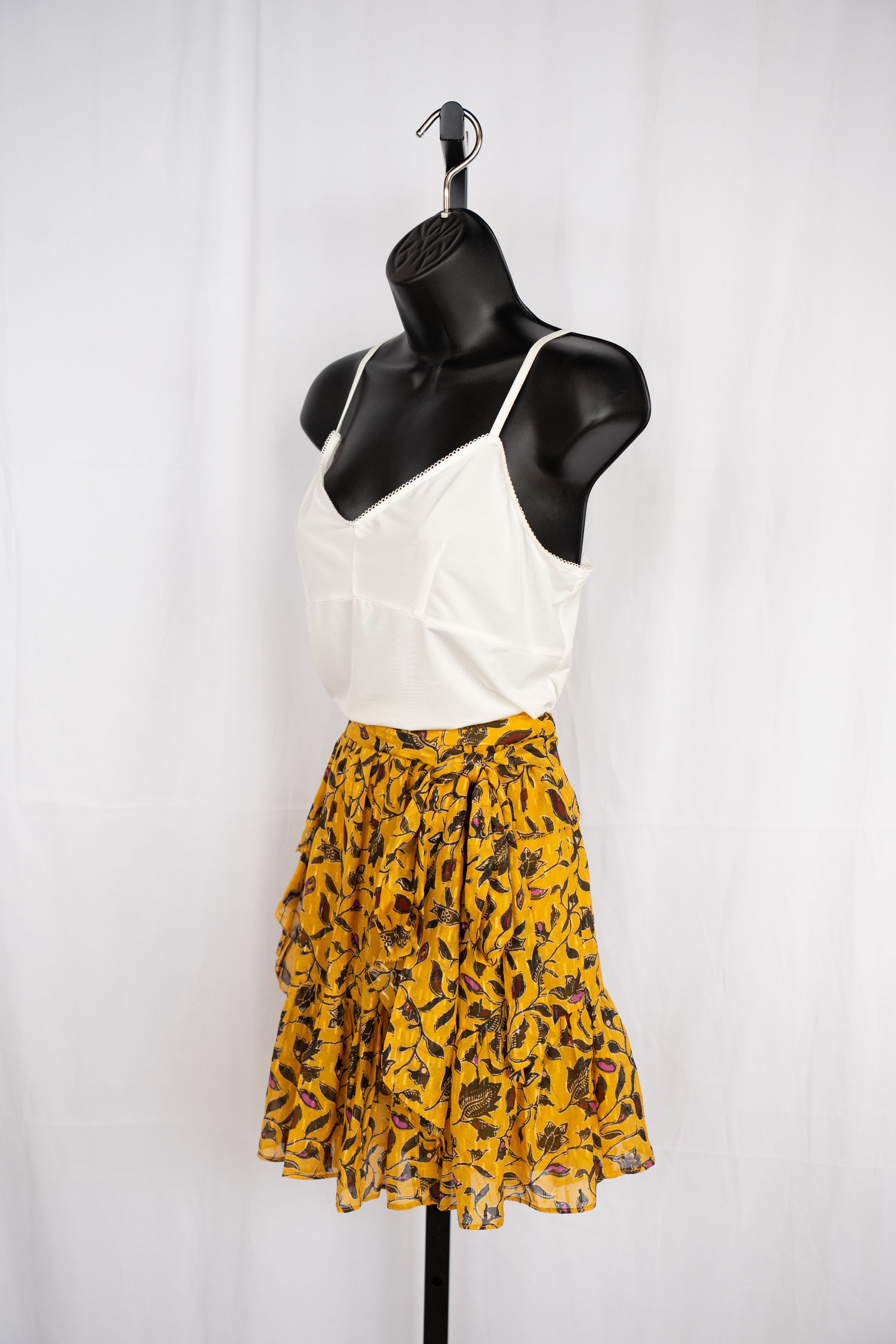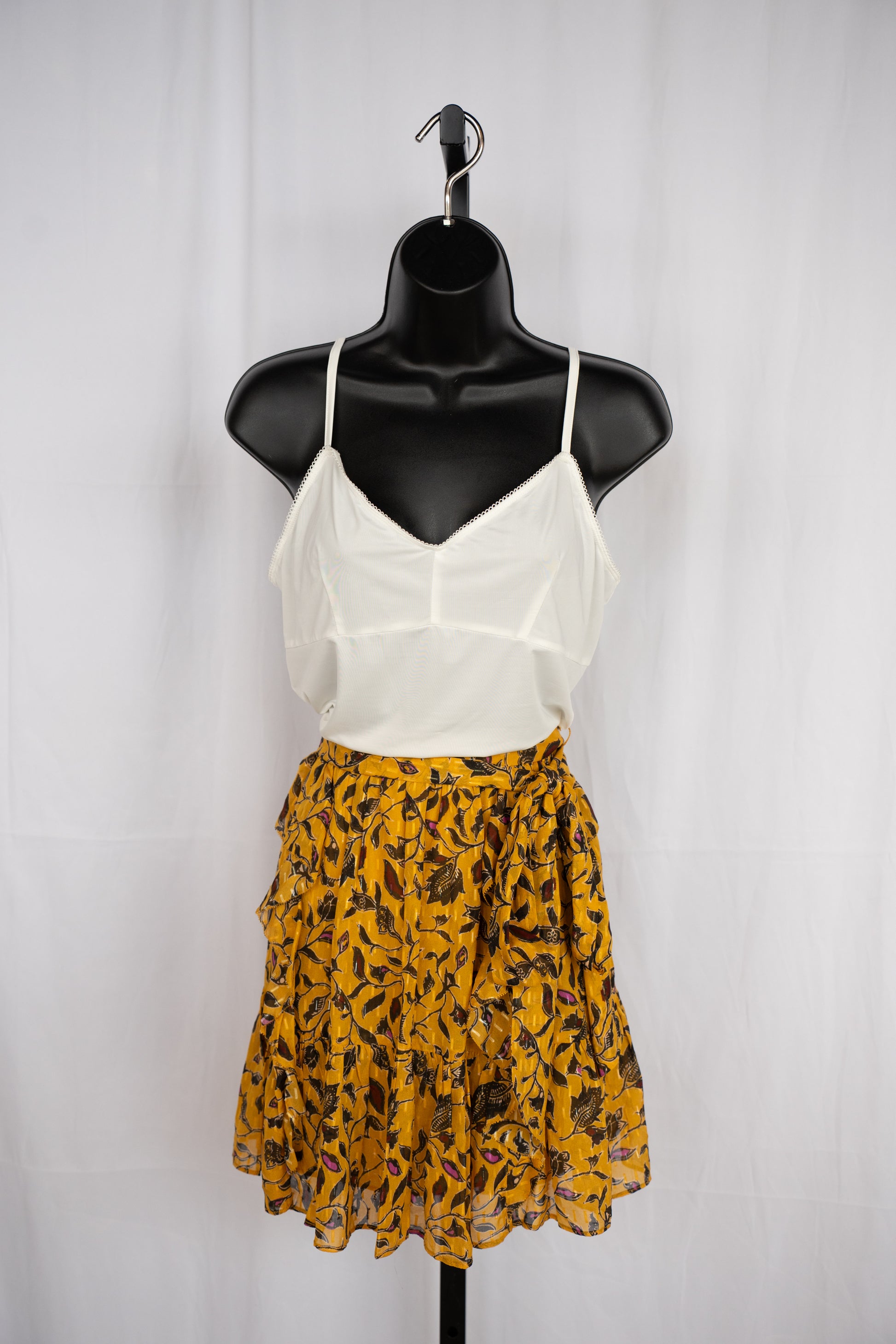 Ulla Johnson Silk Mustard Yellow & Black Floral Ruffle Mini Skirt w Waist Tie