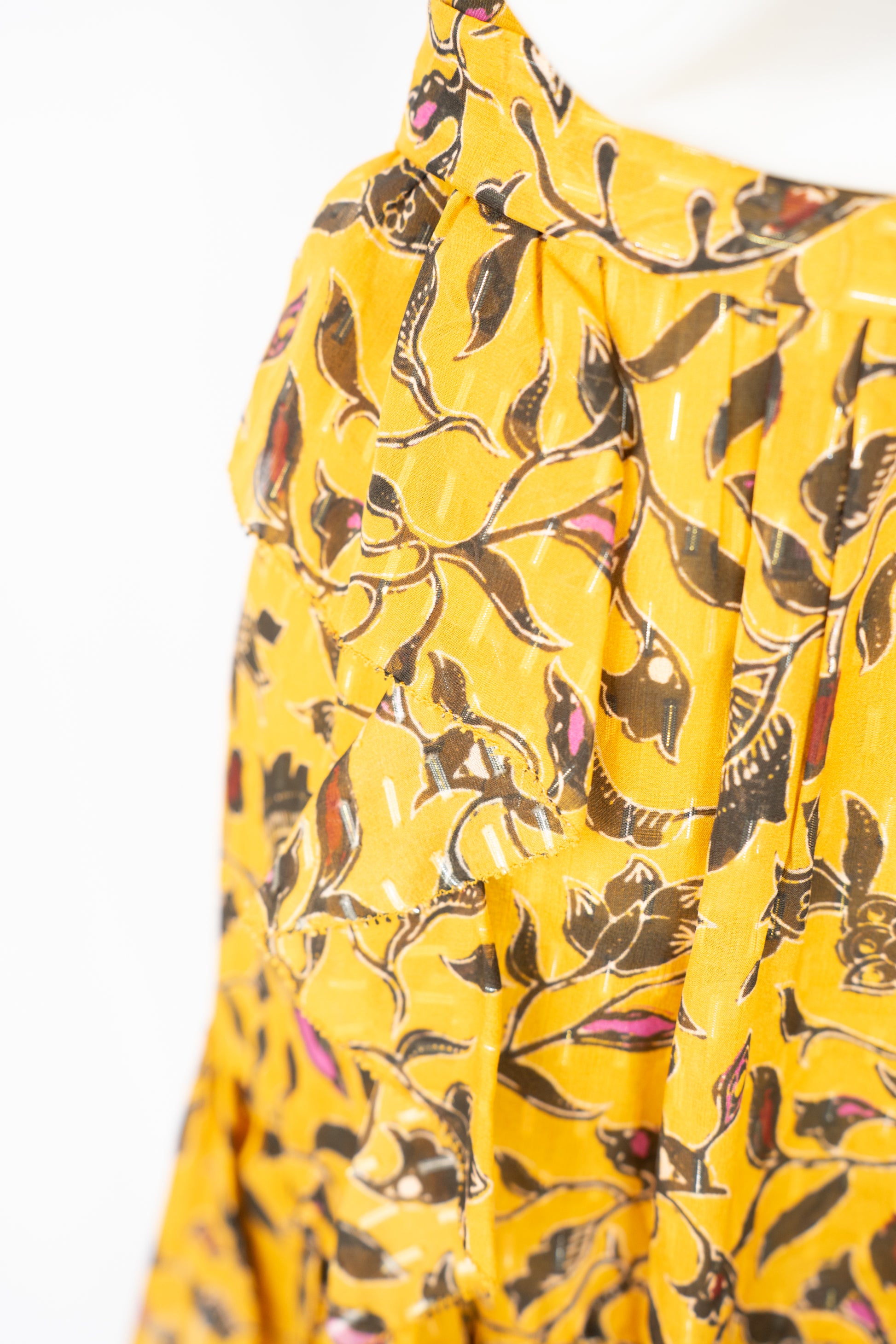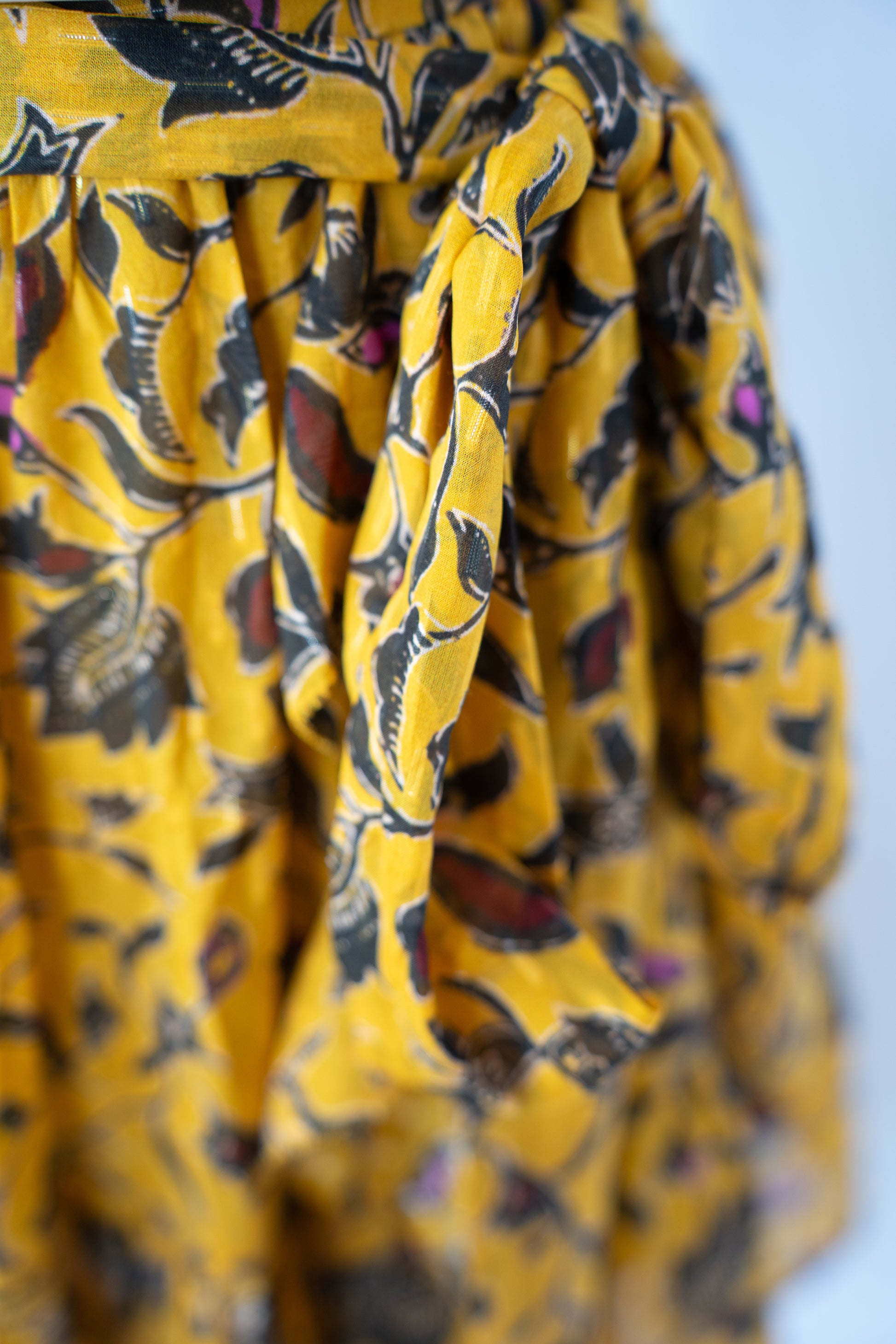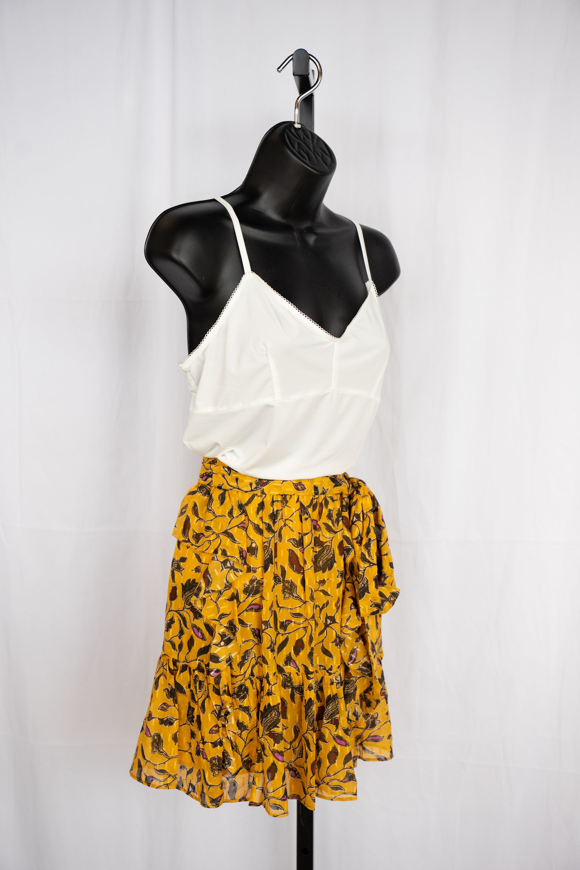 Ulla Johnson Silk Mustard Yellow & Black Floral Ruffle Mini Skirt w Waist Tie