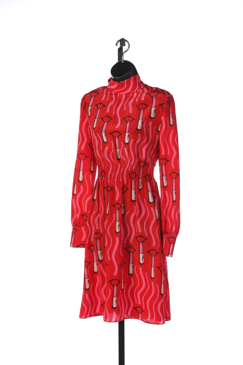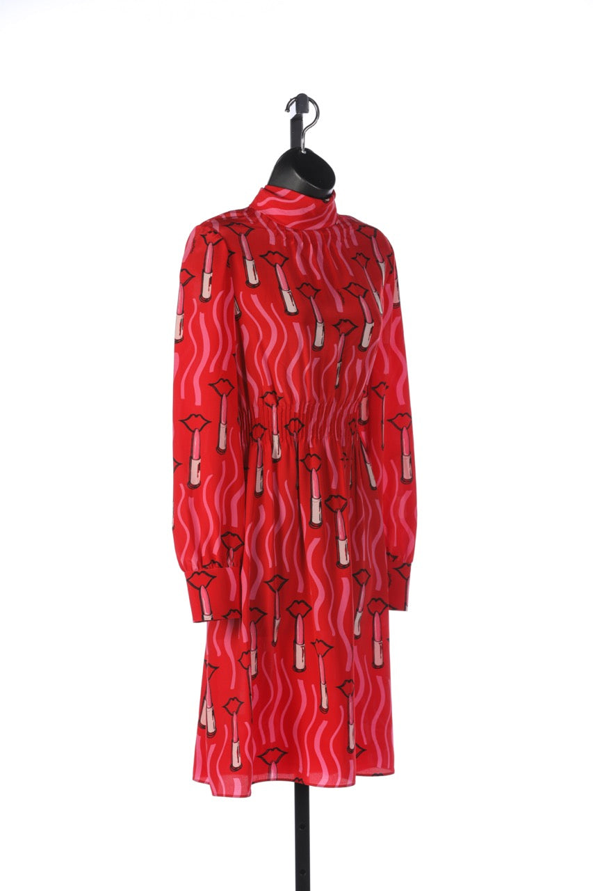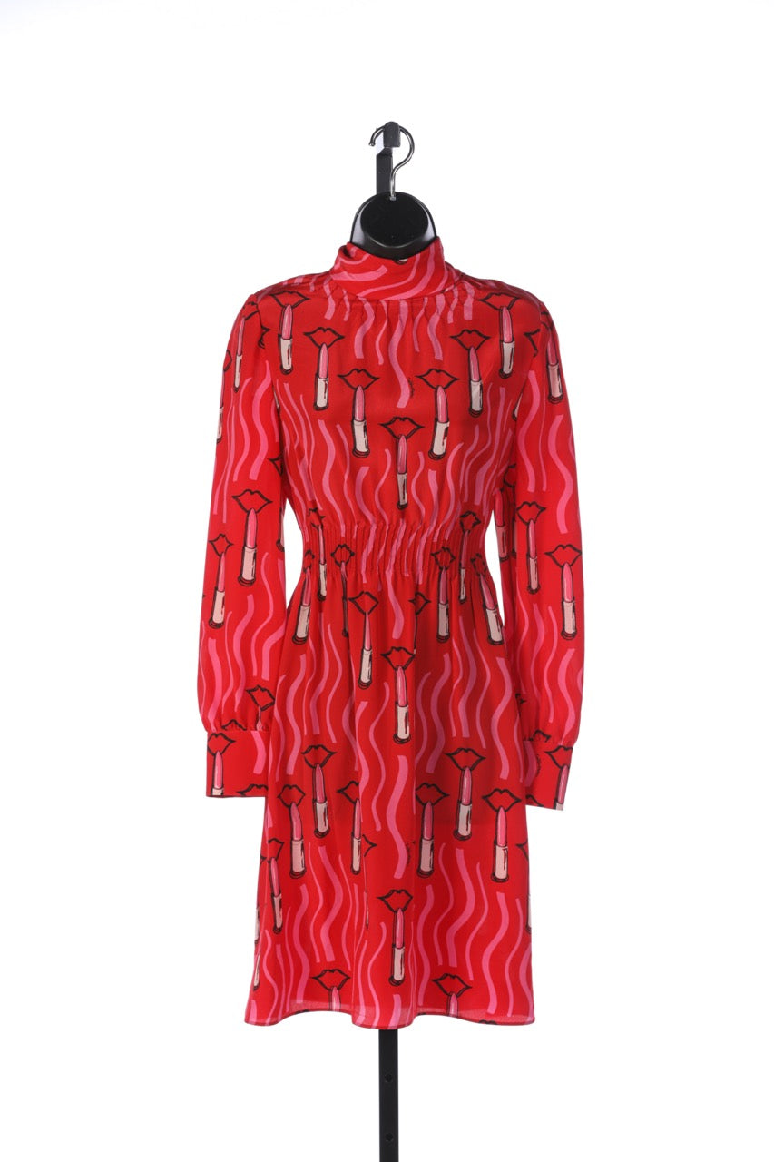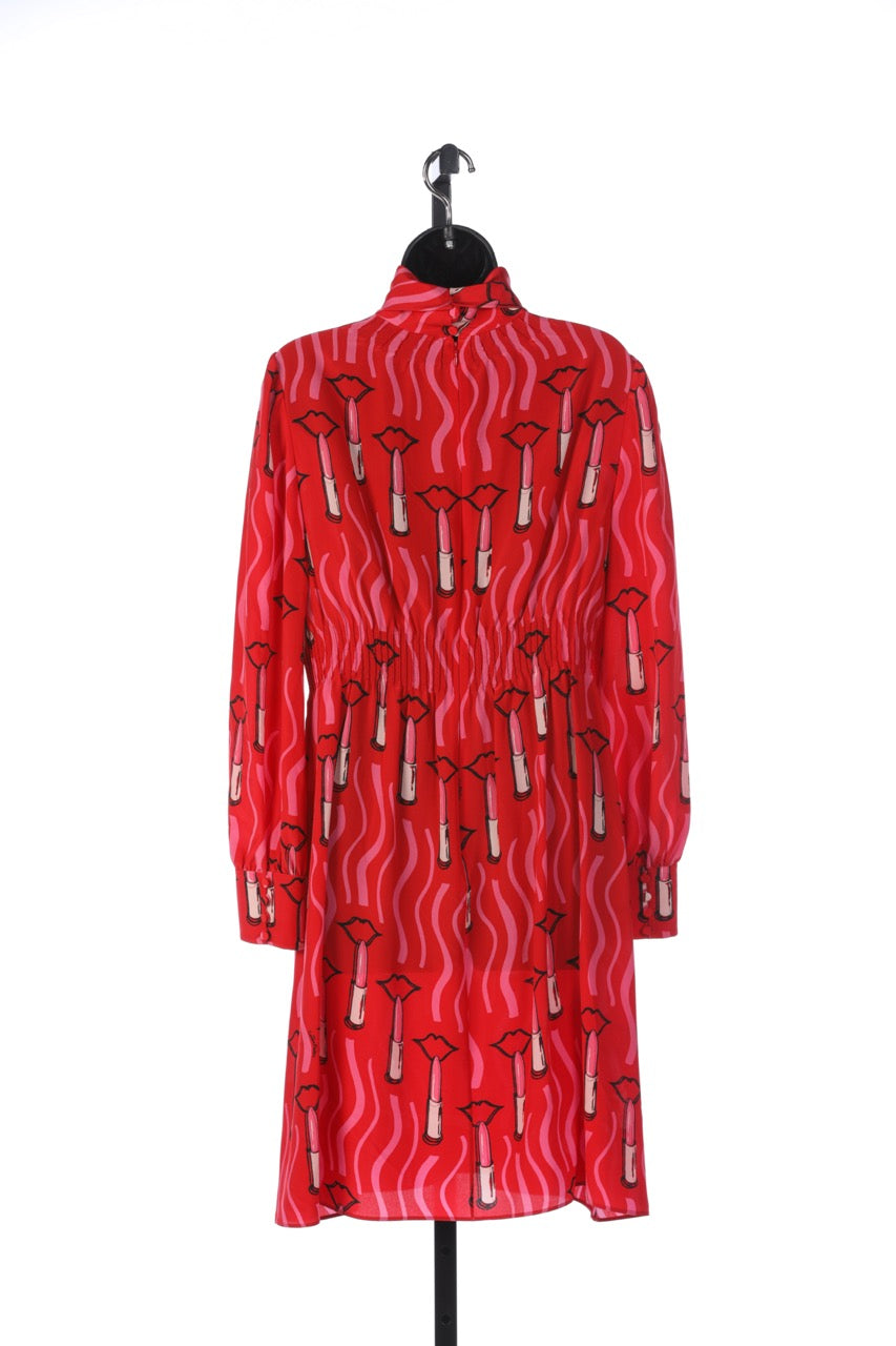 Valentino Silk Red Long-Sleeve Knee-Length Dress with Lipstick Pattern NWT