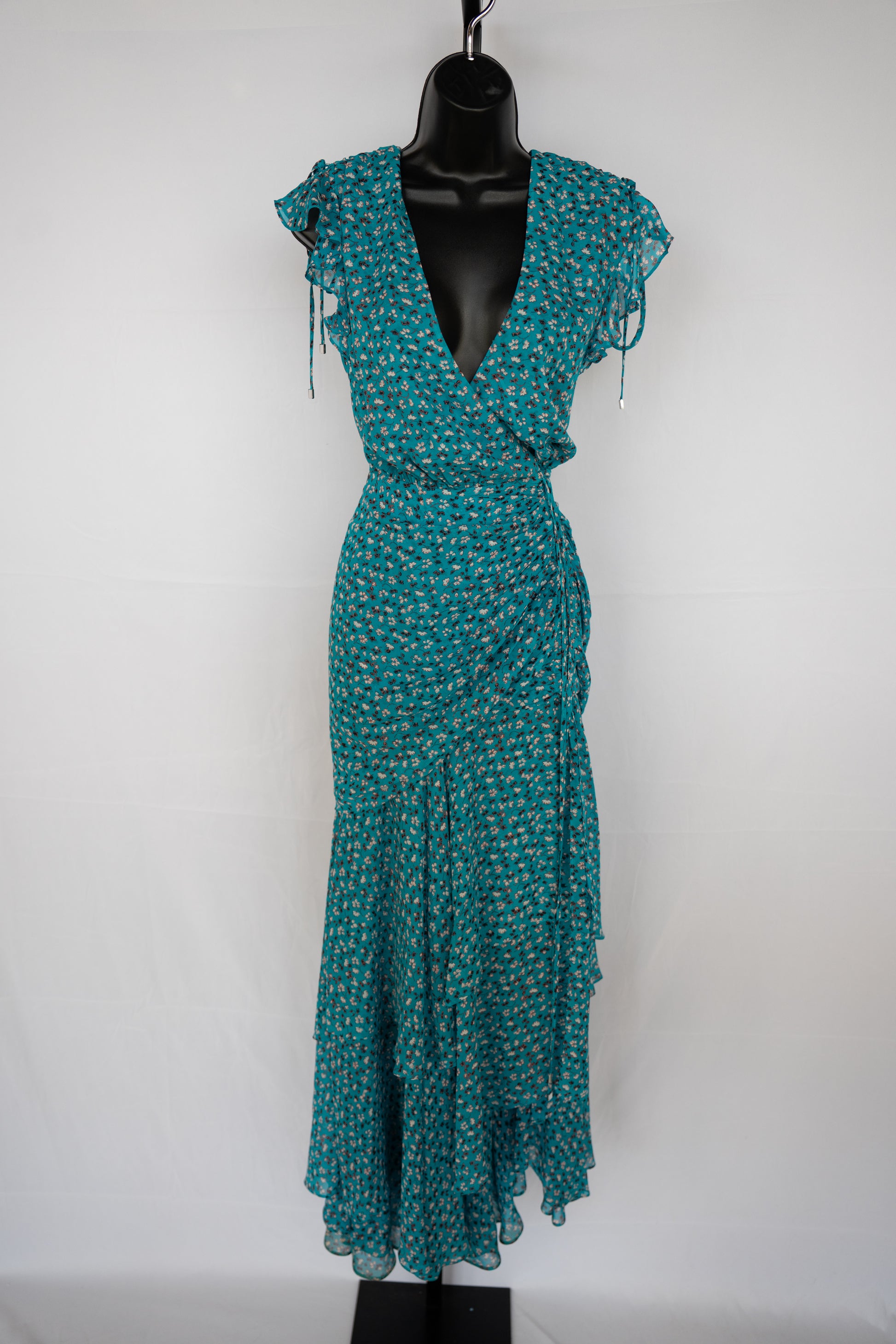 Veronica Beard Blue Silk Floral Cap Sleeve V-Neck Maxi Dress w/ Ruching