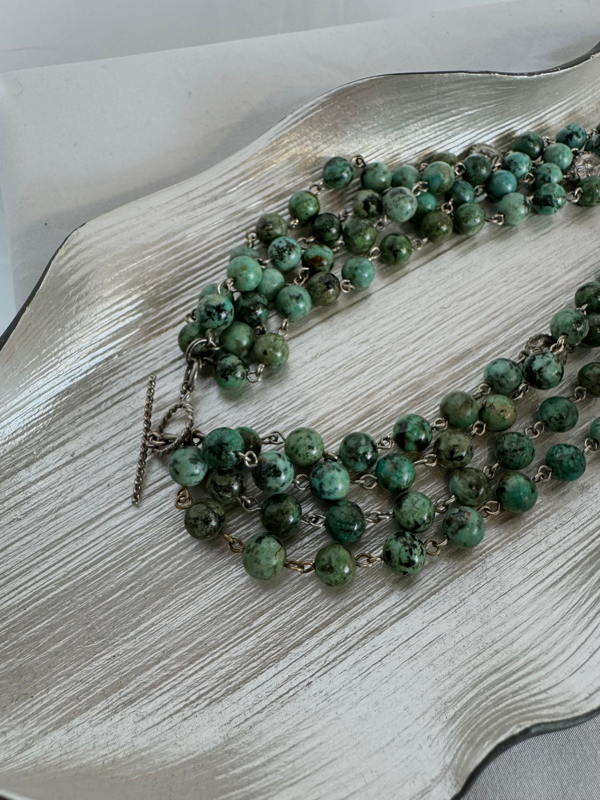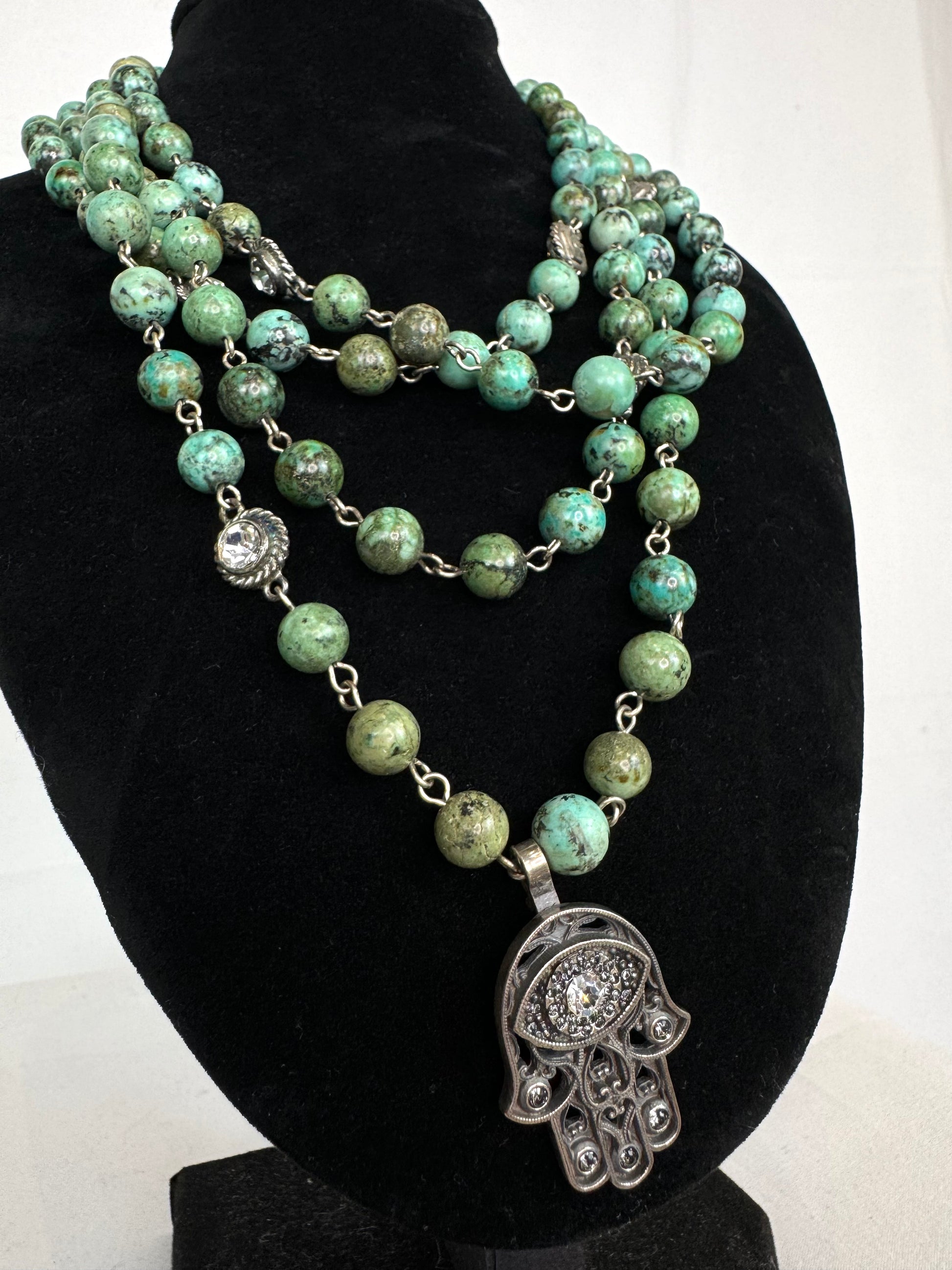 Virgin Saints & Angels Green Turquoise Beaded Multi-strand Necklace with Silver Hamsa Pendant