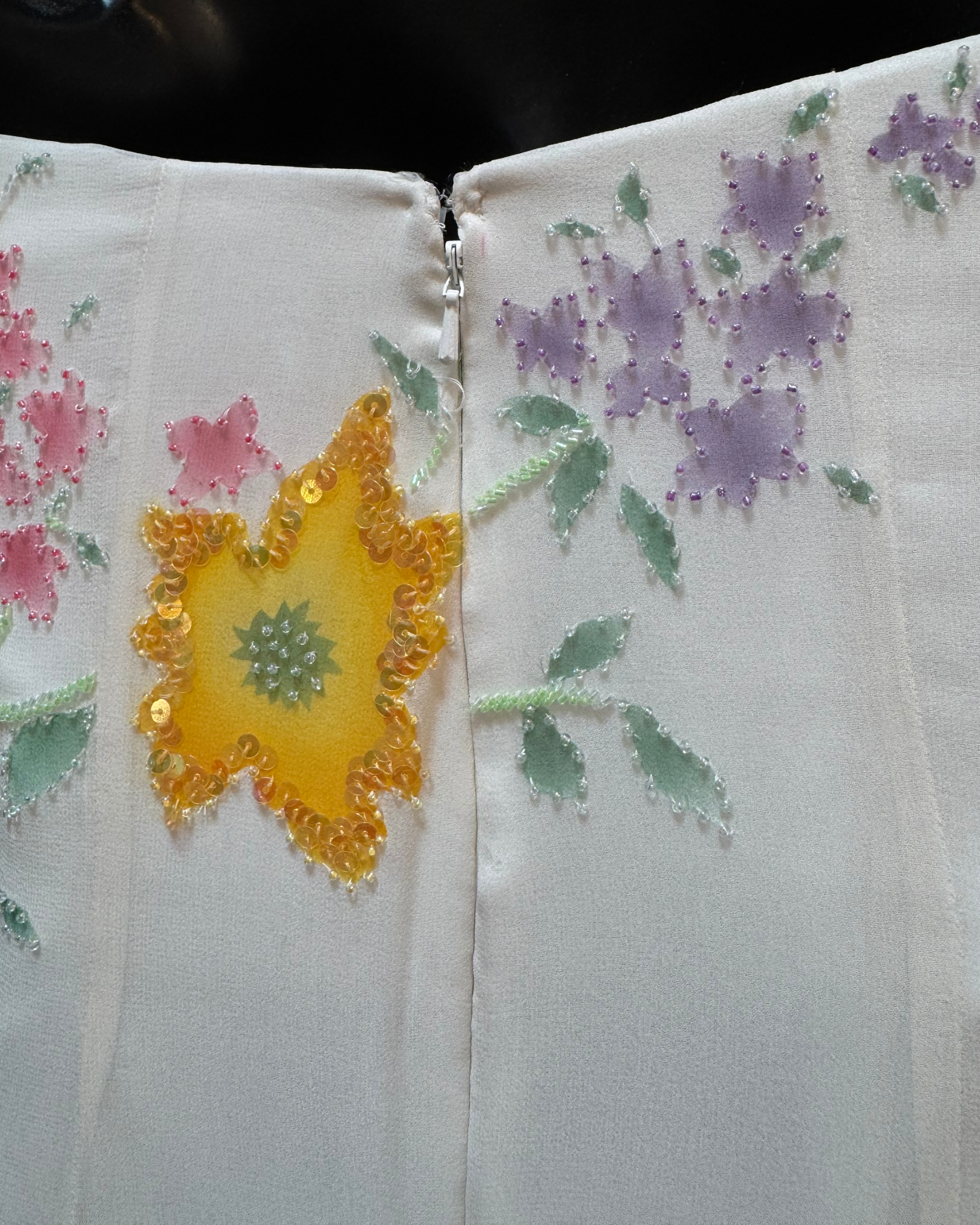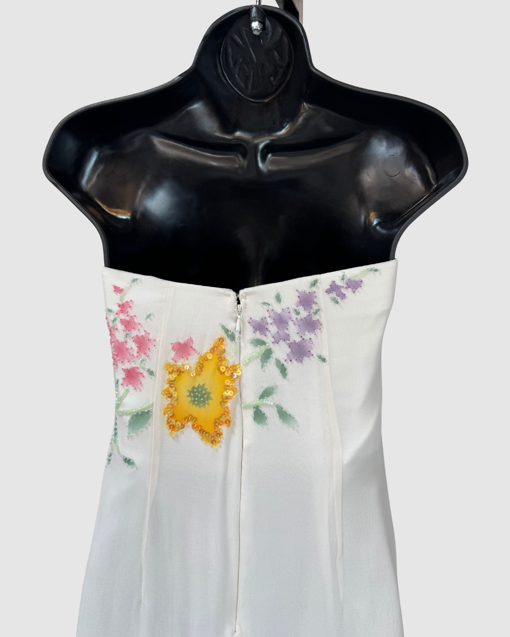 White Satin & Chiffon Strapless Sequin Bead Multi Floral Gown